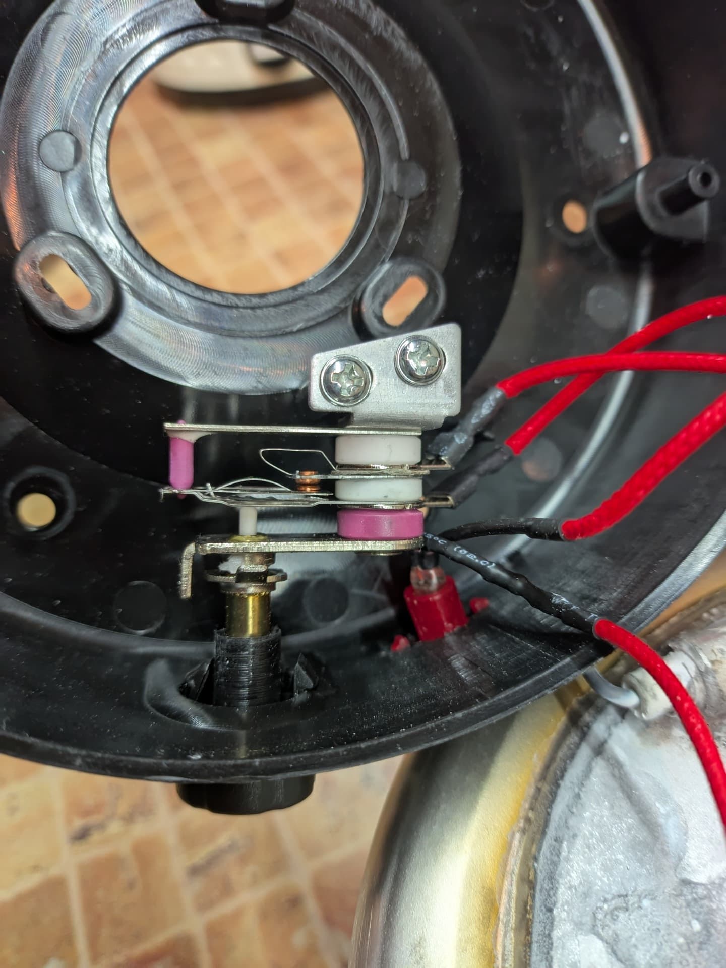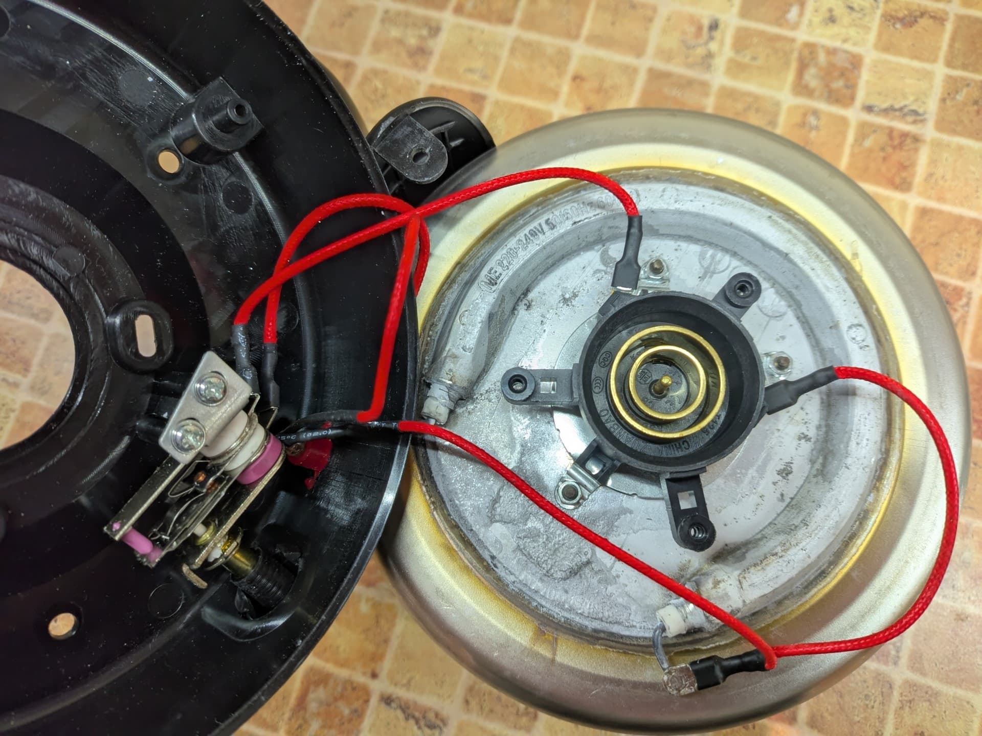 Снизу мы найдем контактную группу, состоящую из двух концентрических колец и центрального штырька, а также еще одну наклейку с технической информацией. Чайник, таким образом, как и положено чайнику, способен вращаться на базе на 360 градусов.