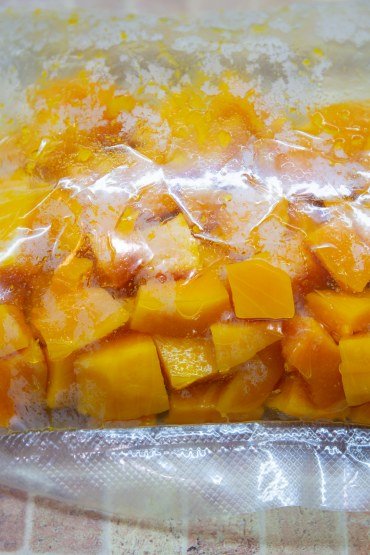 Запаянные пакеты с заранее подготовленными свеклой и тыквой разместили в духовке на двух уровнях. В режиме Air Sous Vide с нагревом до 85 °C тыква дошла до состояния, когда ее можно размять вилкой, уже через час, свекле до полной готовности понадобилось три часа.
