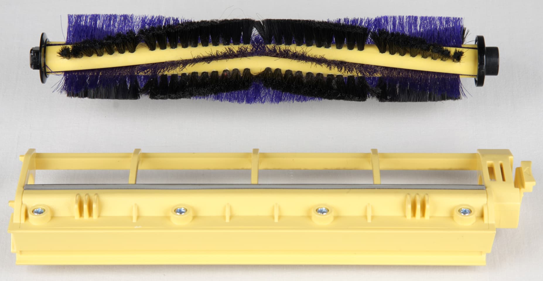 Боковые щеточки представляют собой просто длинные пучки ворса, выходящие из пластиковых бобышек. Гибких поводков, как это было в случае модели Samsung Navibot Silencio SR8895, почему-то нет. В итоге в доставленном нам на тестирование пылесосе, как уже отмечалось, бывшем в употреблении, боковые щеточки свернулись в компактную структуру, напоминавшую гнездо, и уже перестали выполнять свою функцию. Пришлось разглаживать щетину щеток под горячей водой, в результате щетки приобрели почти идеальную форму, что можно видеть на фотографии выше. По завершении тестирования щетки заметно разлохматились, хотя у нас был не самый сложный вариант покрытия — коммерческий ковролин с коротким петлеобразным ворсом.