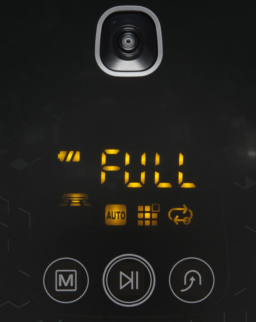 Обозначения кнопок читаются хорошо. Верхняя панель пульта изготовлена из черного маркого пластика с зеркально-гладкой поверхностью, но остальная часть — из более практичного матового черного пластика. К сожалению, пульт работает по ИК-каналу, поэтому для управления пылесосом он должен находиться в пределах прямой видимости и пульт нужно направлять примерно в переднюю часть пылесоса.