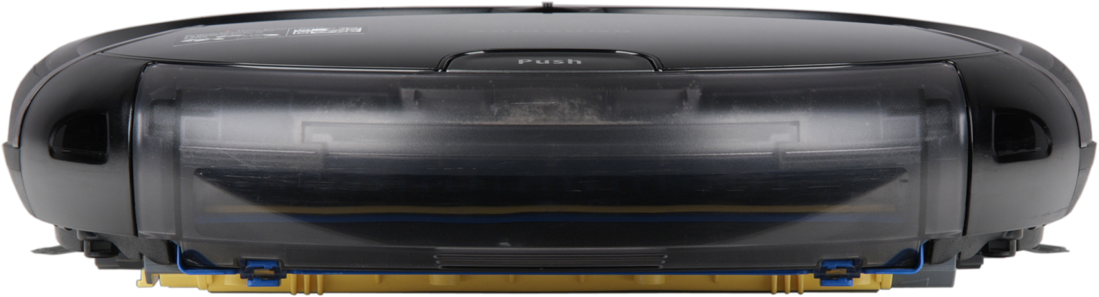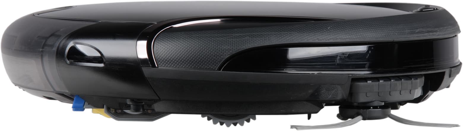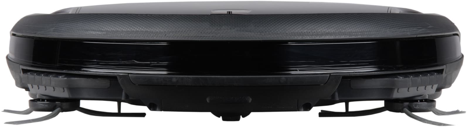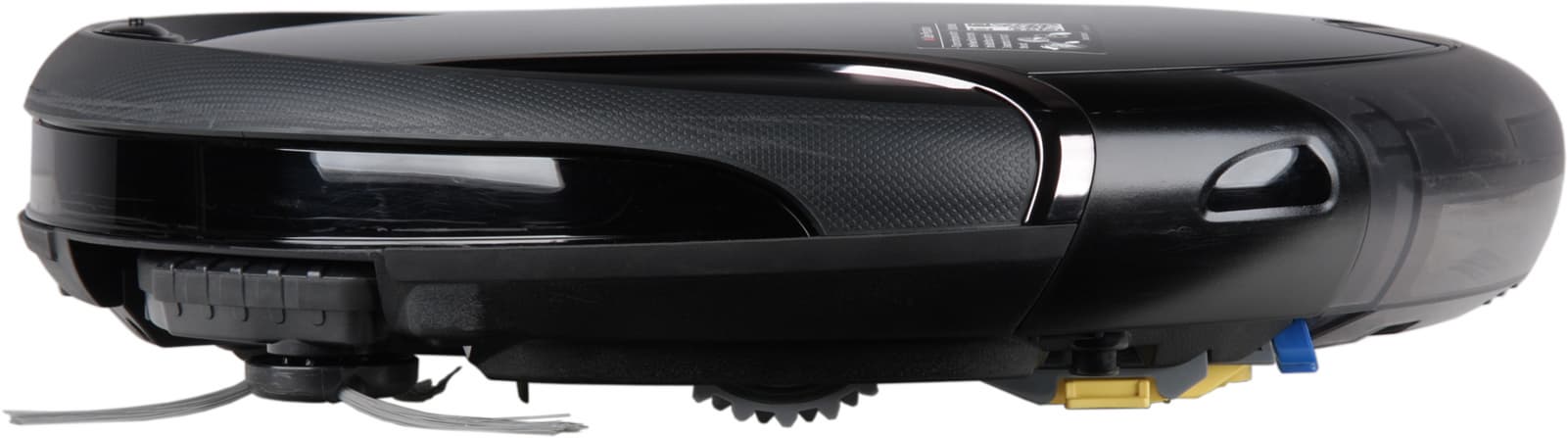 Ниже располагается вставка из зеркально-гладкого прозрачного для ИК-излучания пластика, и только затем корпус переходит в днище из черного пластика с матовой поверхностью. Совсем спереди находится узкий и короткий подпружиненный бампер с небольшим ходом, являющийся механическим датчиком препятствий. Окружность корпуса продолжают две вставки из черного пластика с окошками, за которыми возможно находятся очередные ИК-датчики, и завершает ее пристыкованный сзади пылесборник.