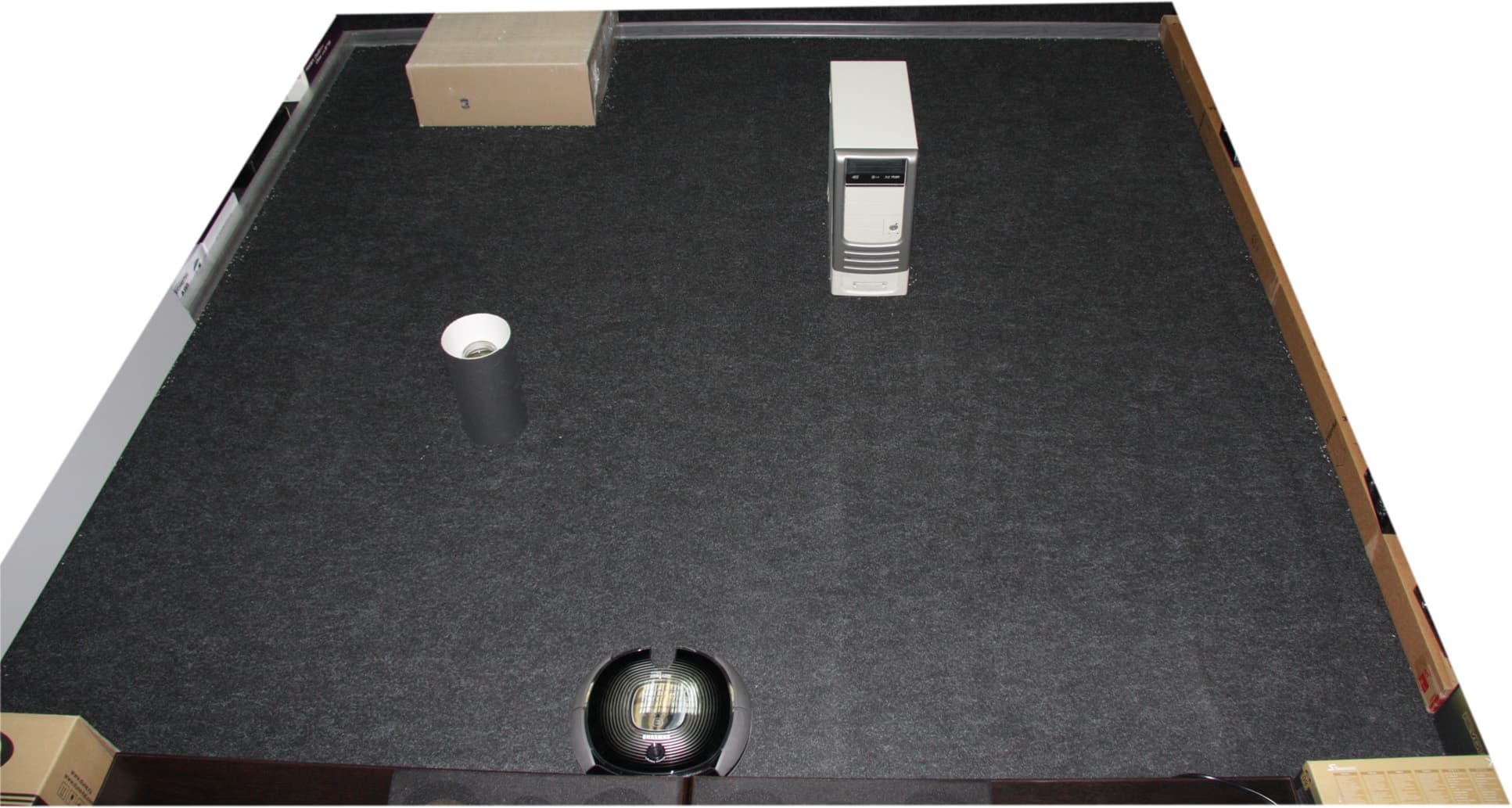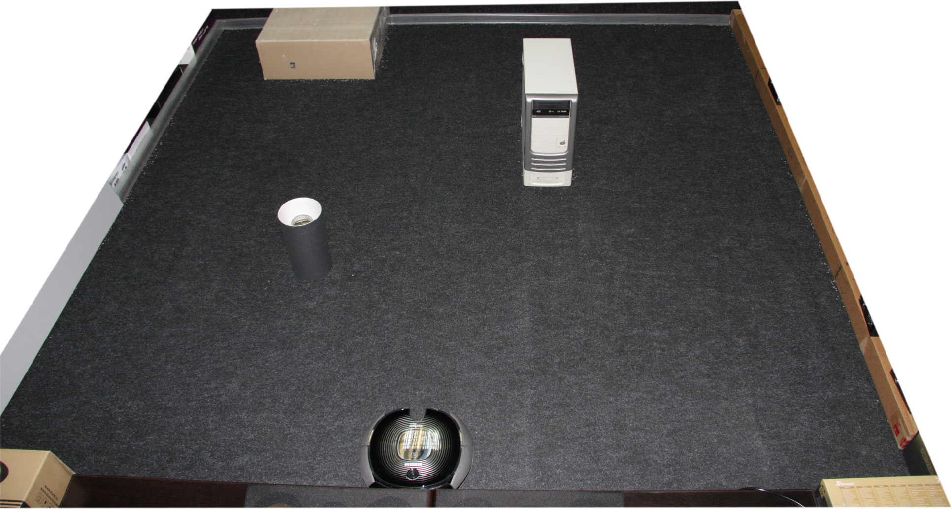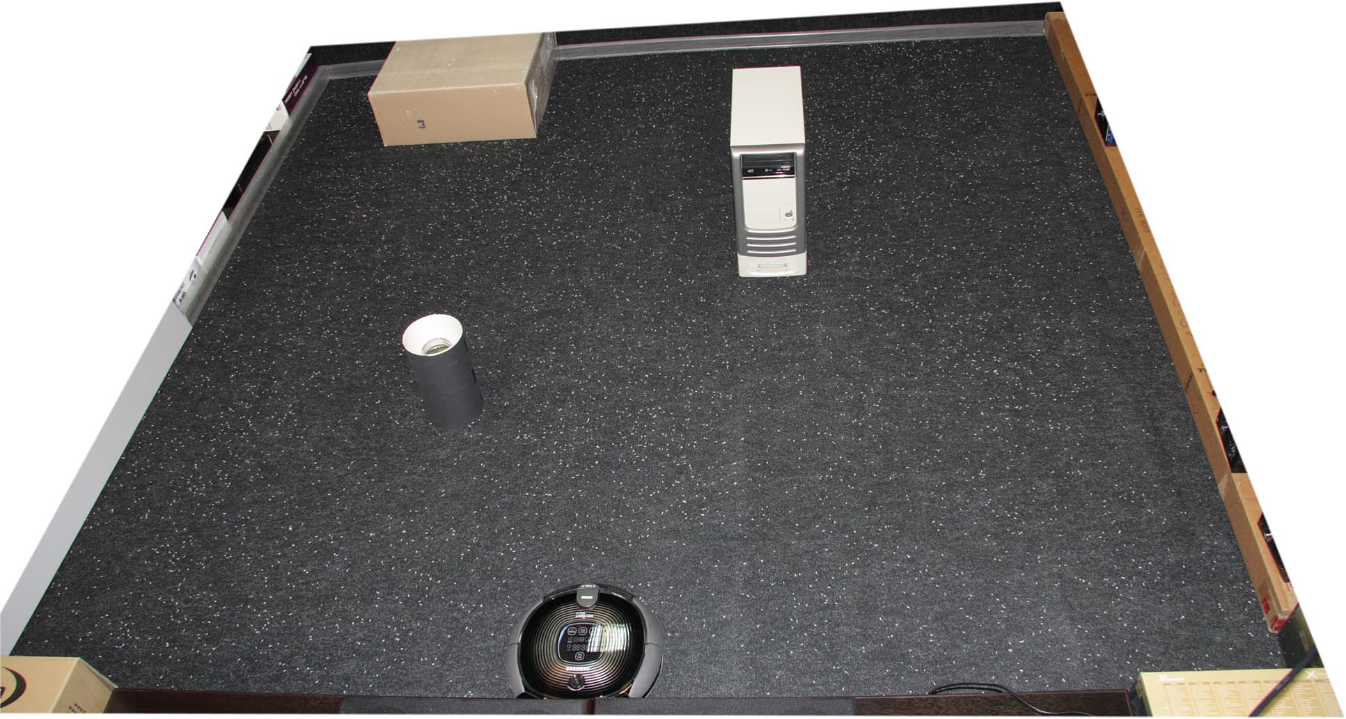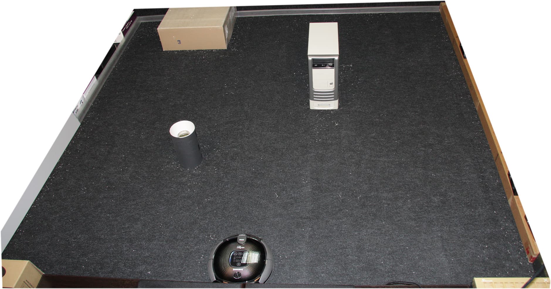 Для тестирования роботов-пылесосов в офисном помещении подручными средствами (коробки, перевернутый стол, колонки на боку и т. д.) было огорожено пространство 3 на 3 м. Напольное покрытие этой арены — коммерческий ковролин с плотным петлеобразным ворсом, что является некоторым промежуточным вариантом между длинноворсным ковром и гладкой поверхностью. Имитацией возможных препятствий служат компьютерный корпус типичных размеров, цилиндр и тесный загончик глубиной 60 см и шириной на 5 см шире корпуса пылесоса в самом широком месте. Цилиндр служит некоторой имитацией небольшого препятствия типа ножки стола или дивана, вокруг которого нужно убрать мусор. Мы не стали создавать препятствия, имитирующие пороги, так как нет таких понятий, как стандартная высота порога и форма его профиля. При этом использование порога с регулируемой высотой или набора различных по высоте порогов, с целью, например, определения максимальной высоты порога, которую может преодолеть пылесос, привело бы к неоправданному усложнению тестов. Примерно по центру одной из стен помещается зарядная база с пылесосом на ней или, если базы нет, то сам пылесос. На схеме ниже указаны все геометрические параметры. Границы предметов и арены обозначены толстыми черными линиями, серым цветом закрашены площади недоступные для пылесоса.
