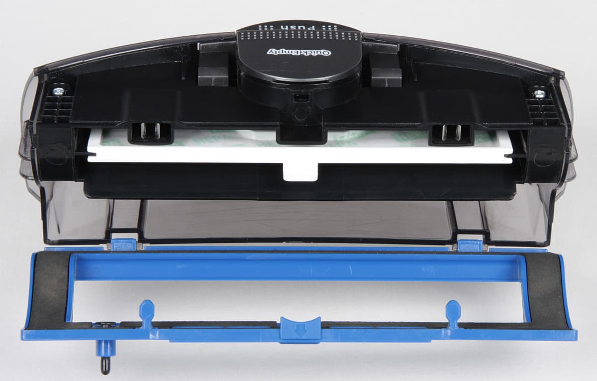 Корпус пылесборника частично выполнен из прозрачного слегка тонированного пластика, что позволяет контролировать его наполнение, по крайней мере, пока его стенки не сильно загрязнены. Быстро удалить мусор из пылесборника можно следующим образом: открыть крышечку с надписью Quick Empty и через открывшееся отверстие отсосать пыль обычным пылесосом.
