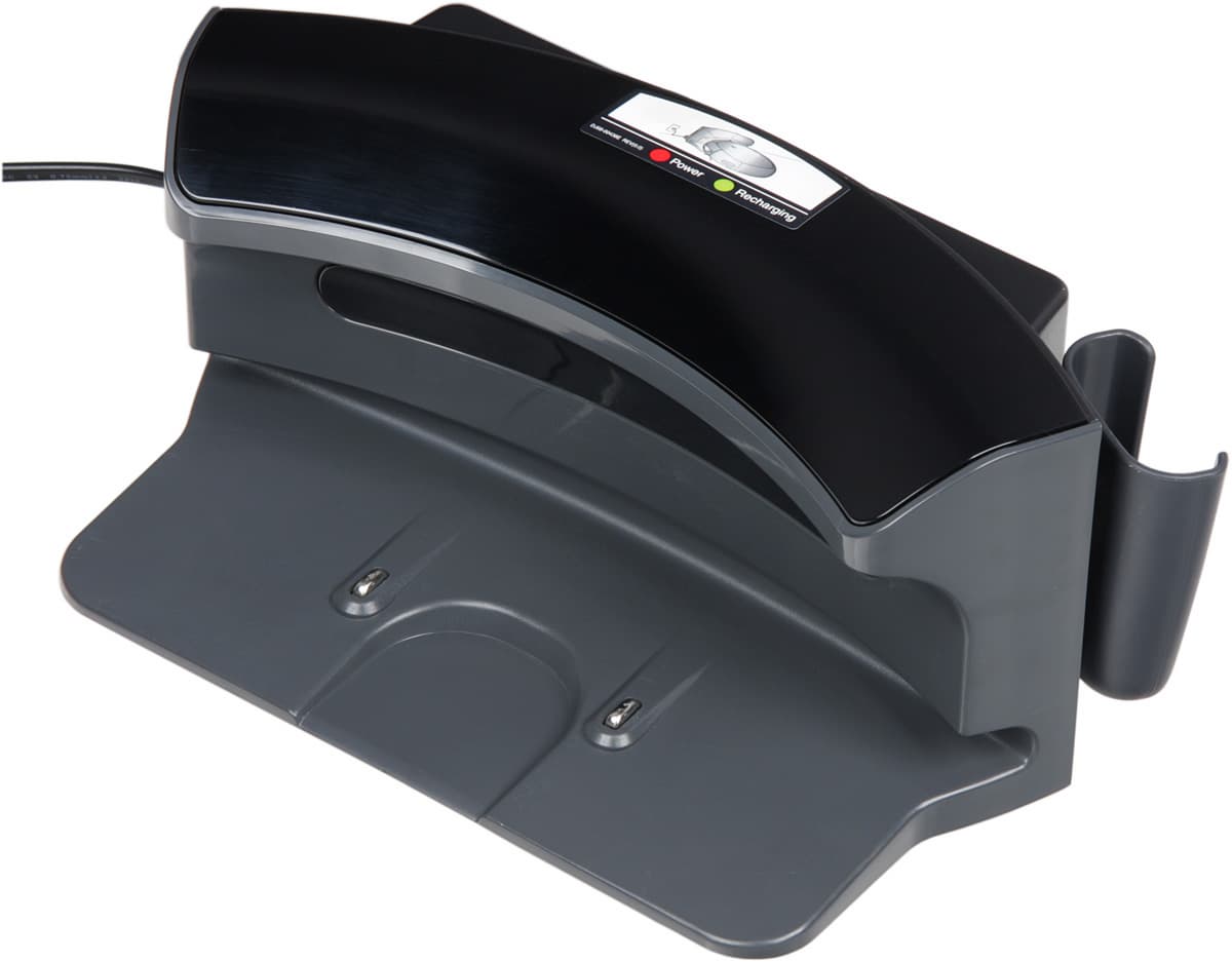 База, на которой пылесос подзаряжается, имеет встроенный блок питания, что придает ей дополнительный вес. Основание базы относительно большое и снизу на нем находятся две резиновые ножки и две резиновые фигурные площадки.