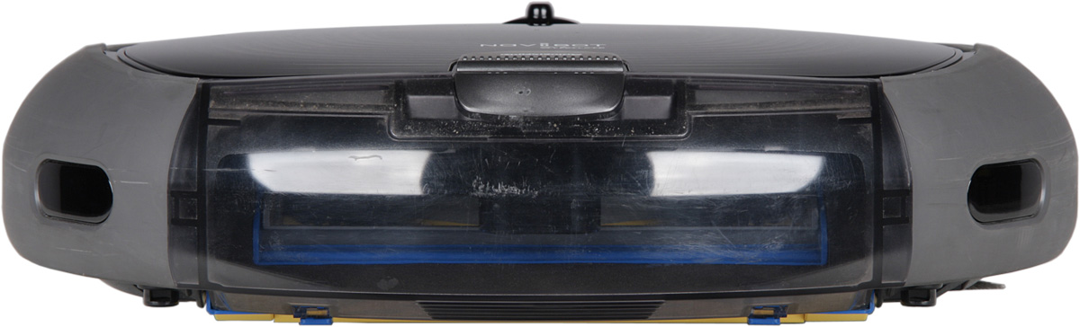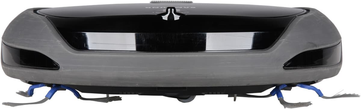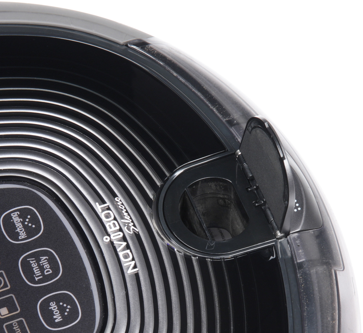 Тут есть один неприятный момент — каким-то образом между панелью и подложкой умудряются попадать пылинки, которые очень бросаются в глаза на темном фоне и которые практически невозможно удалить. Сверху в центре располагается контрольная панель с четырьмя сенсорными кнопками (видимо, применены ИК-датчики), четырехразрядным светодиодным семисегментным индикатором и вспомогательными значками со светодиодной подсветкой. В передней части находится круговая направленная вверх видеокамера для ориентации по потолку, в задней части — лючок для быстрого удаления пыли и кнопка фиксации пылесборника. По бокам всю переднюю половину корпуса огибает подпружиненный бампер с небольшим ходом. В передней части бампера расположен невысокий выступ.