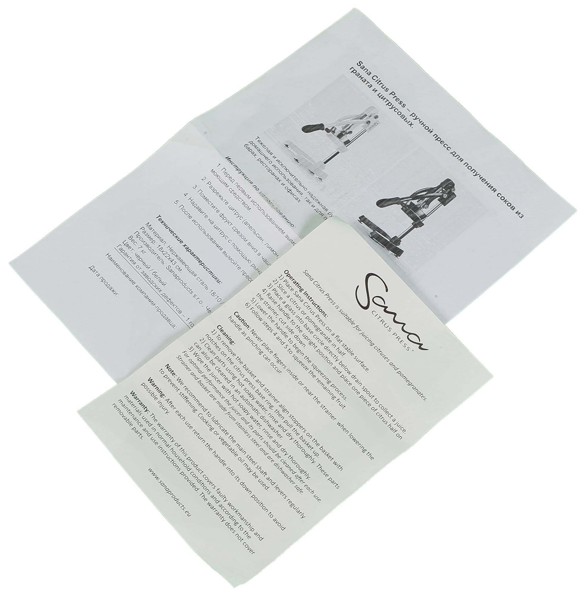 Полезной информации немного: изучив обе инструкции, мы узнали, что пресс подходит для работы с цитрусовыми и гранатами, а также ознакомились с правилами ухода за ним.