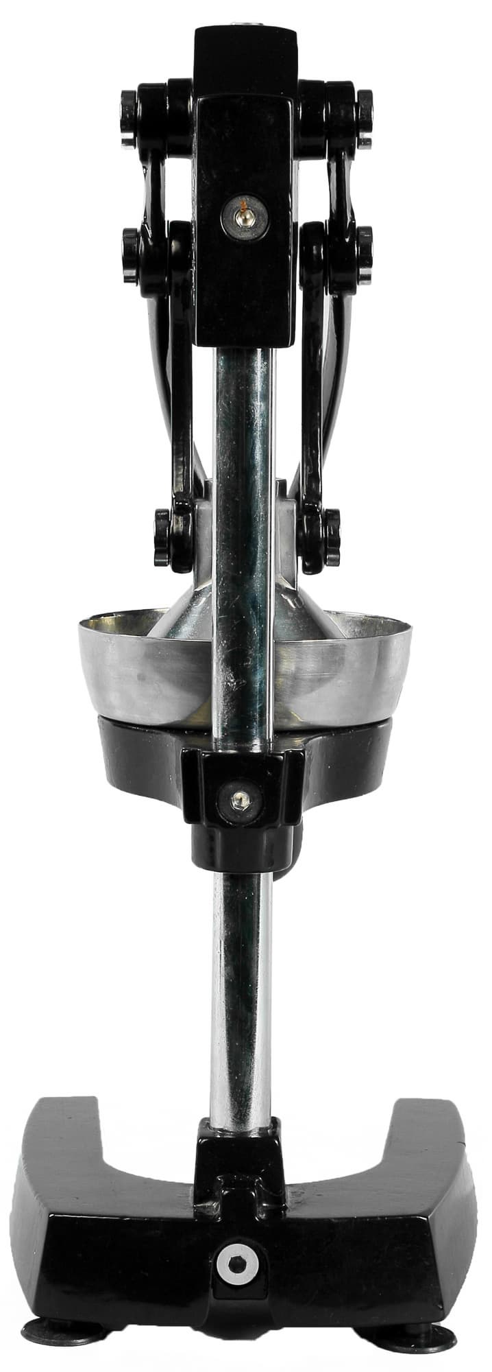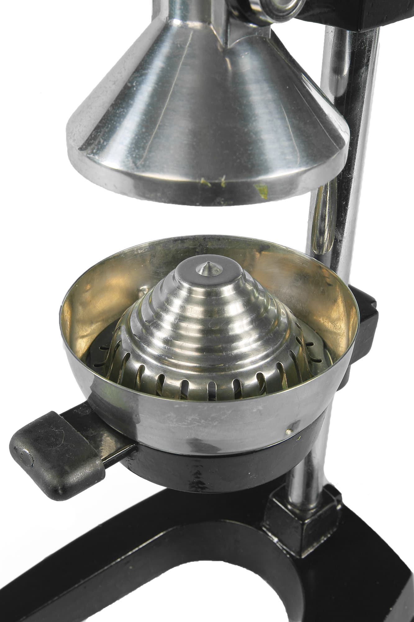 Чаша для отжима состоит из трех основных элементов, сделанных из нержавеющей стали: верхний конус закреплен на подвижной части. Нижняя (съемная) часть состоит из воронки и решетки-фильтра, предотвращающей попадание косточек в отжатый сок. Съемные элементы имеют специальные выступы и вырезы, позволяющие зафиксировать их в рабочем положении. Фиксация осуществляется поворотом элементов относительно друг друга (или относительно корпуса прибора).
