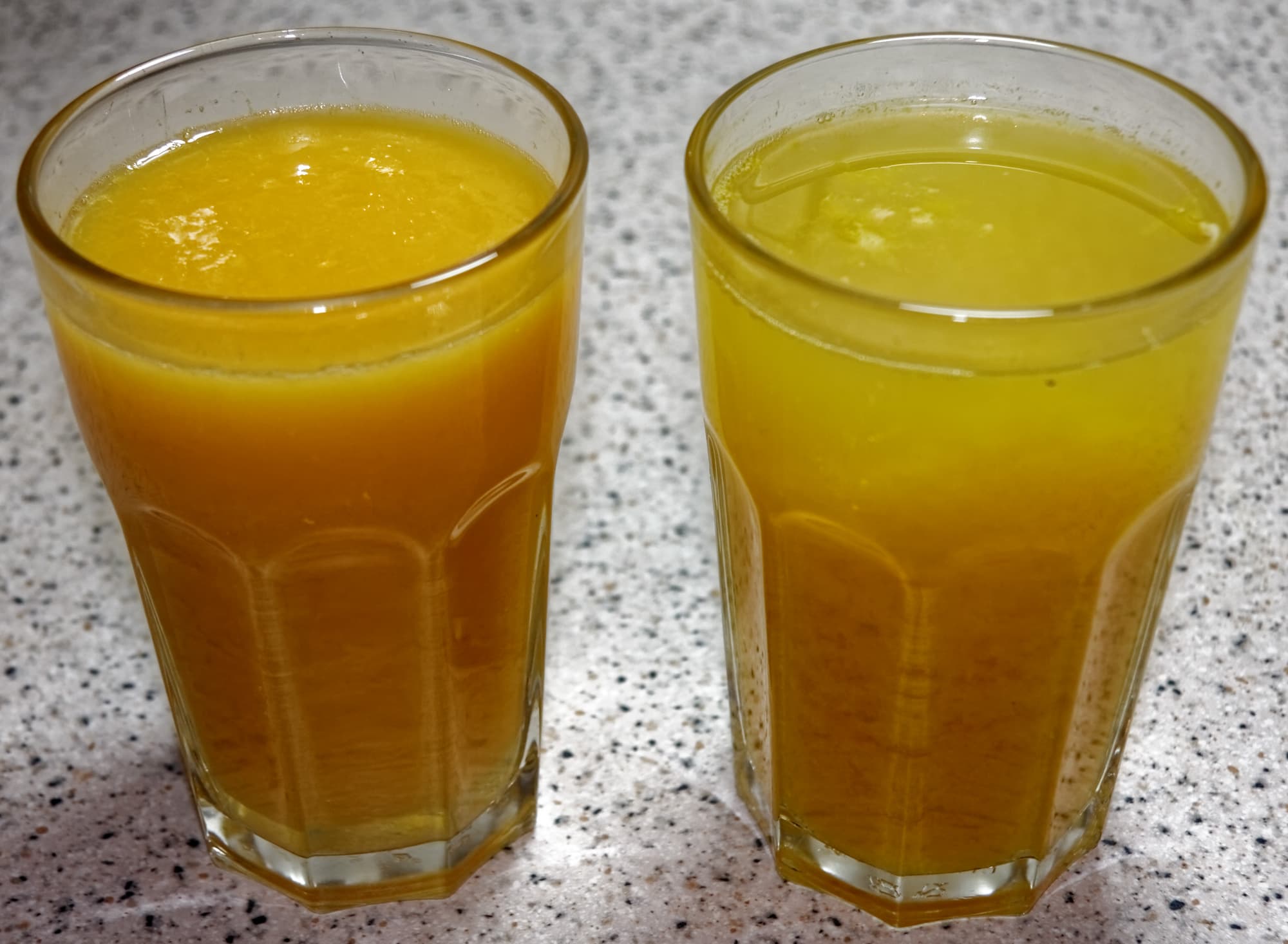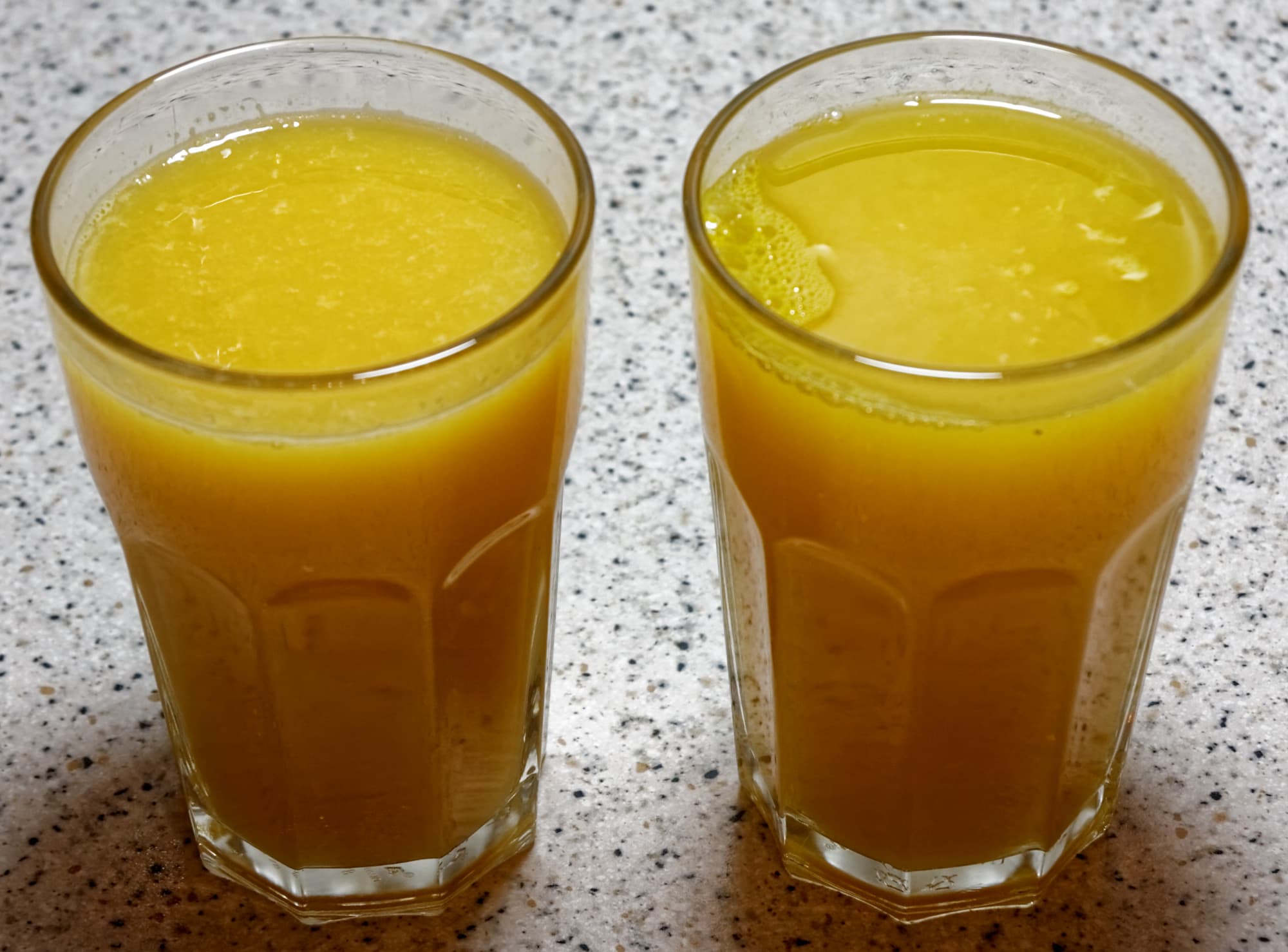 На всех фото: слева — сок из шнековой соковыжималки, справа — из пресса.