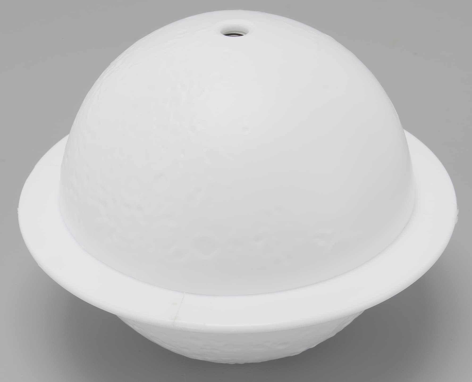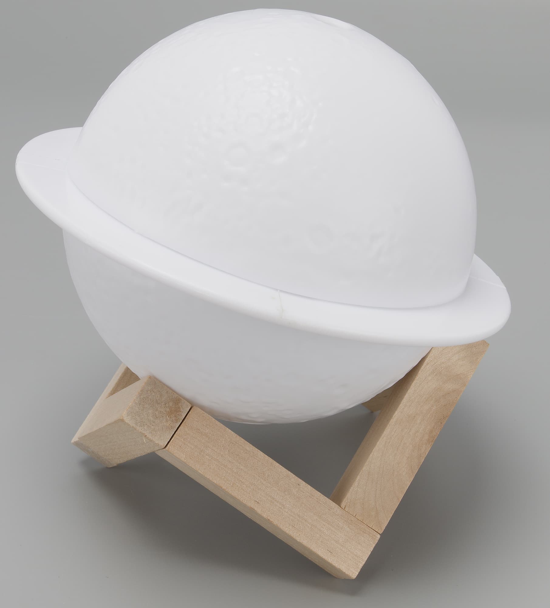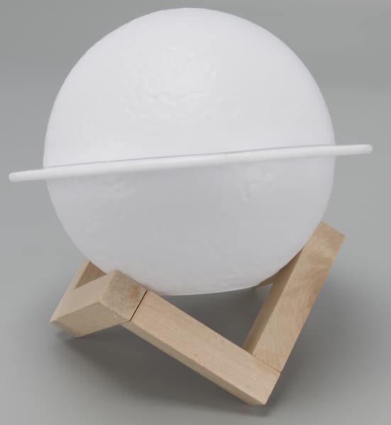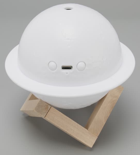 Корпус увлажнителя (условно назовем исследуемый прибор именно так) сделан из полупрозрачного белого пластика и имеет форму сферы. «Космический» вид «сатурну» придают декоративный поясок, напоминающий о кольцах этой планеты, и фактура поверхности, похожая на лунные кратеры.