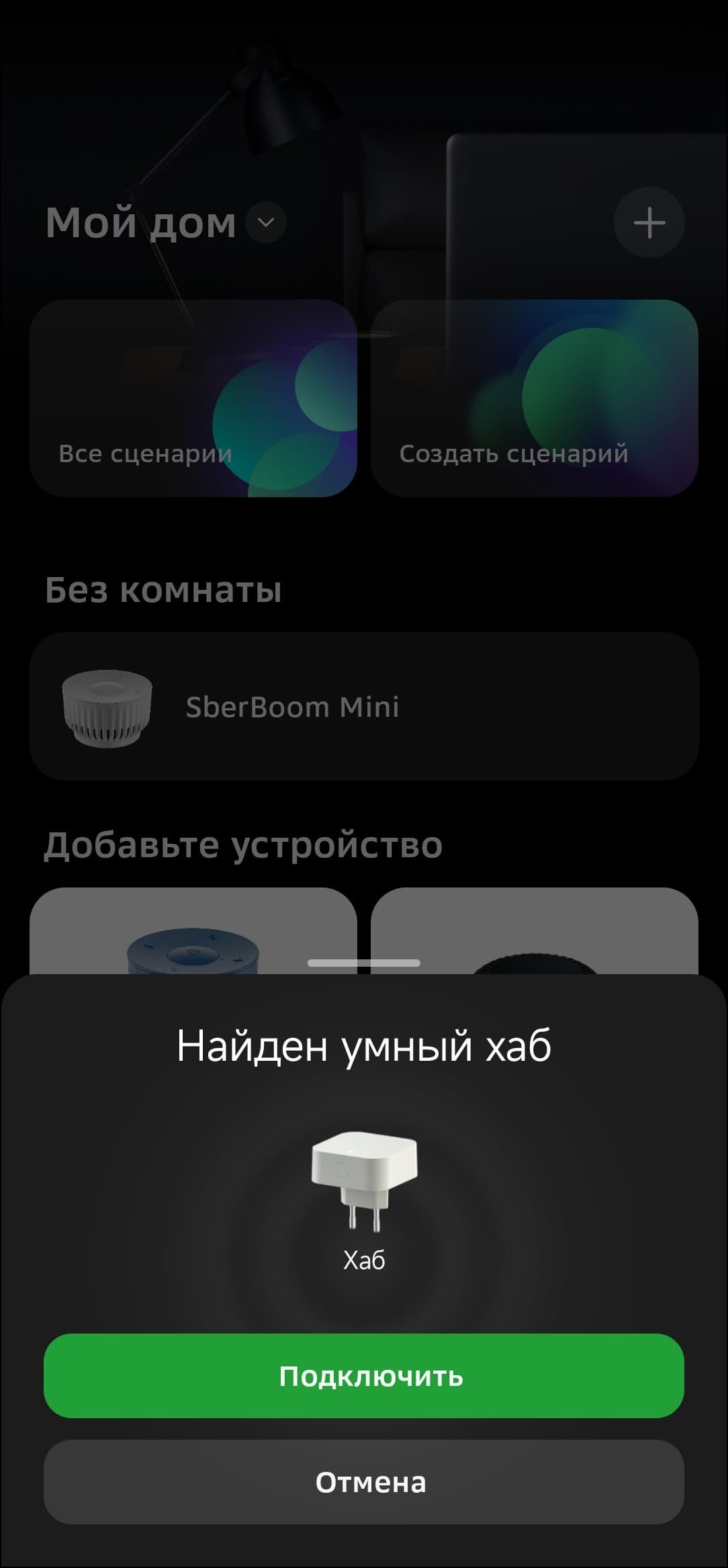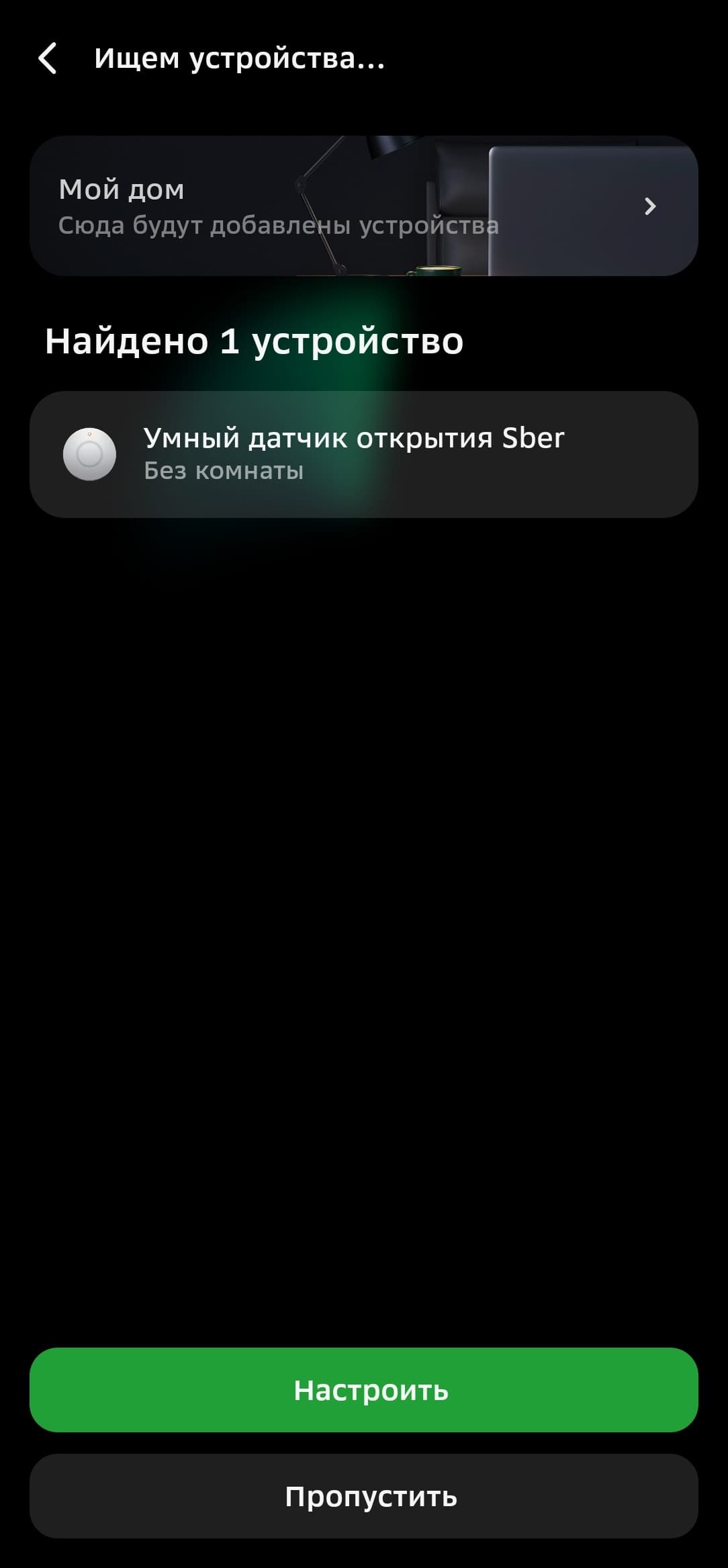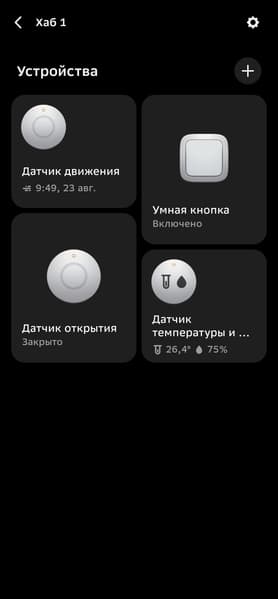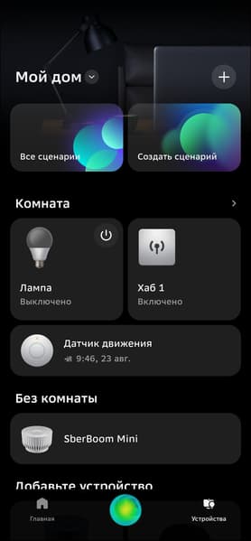 Zigbee-устройства можно подключать из вкладки хаба в приложении, но собственные продукты Сбера удобнее начинать настраивать из главного меню, в таком случае система наглядно демонстрирует, как подготовить датчики к работе. Так и будем поступать.