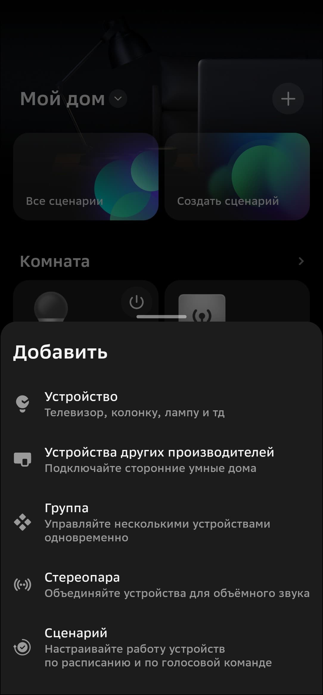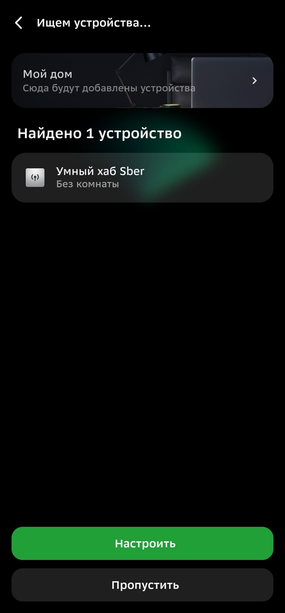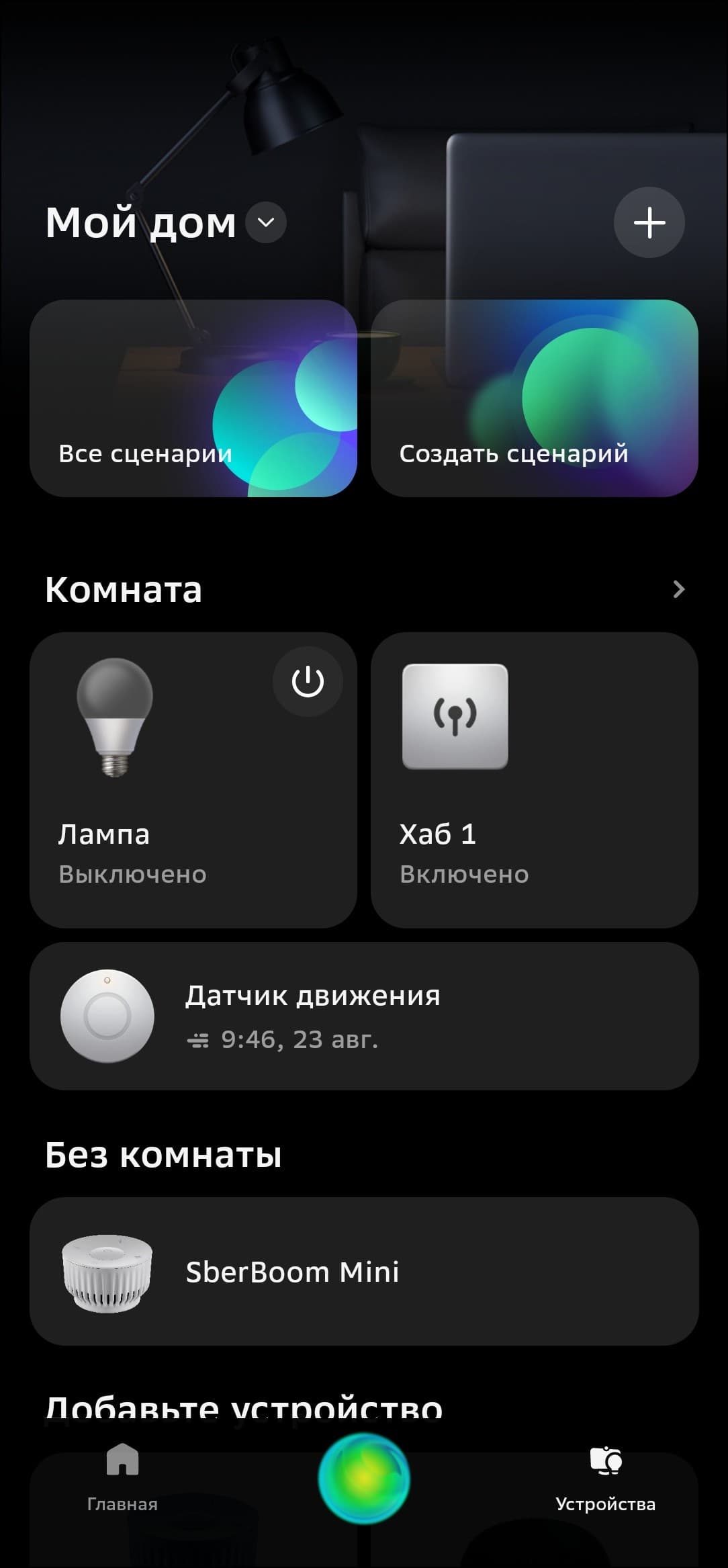 Zigbee-устройства можно подключать из вкладки хаба в приложении, но собственные продукты Сбера удобнее начинать настраивать из главного меню, в таком случае система наглядно демонстрирует, как подготовить датчики к работе. Так и будем поступать.