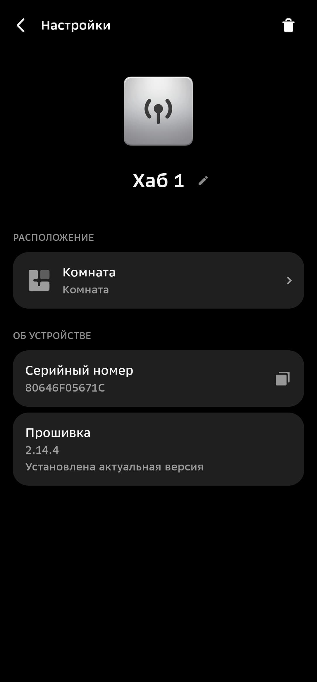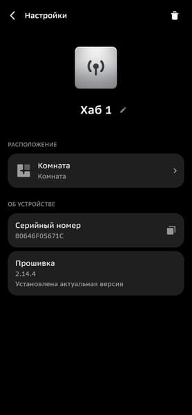 Остается добавить устройство в какую-нибудь комнату, ну и еще чуть подождать, если система найдет обновления прошивки. Переименовать хаб или переместить его в другую комнату всегда можно на странице устройства.