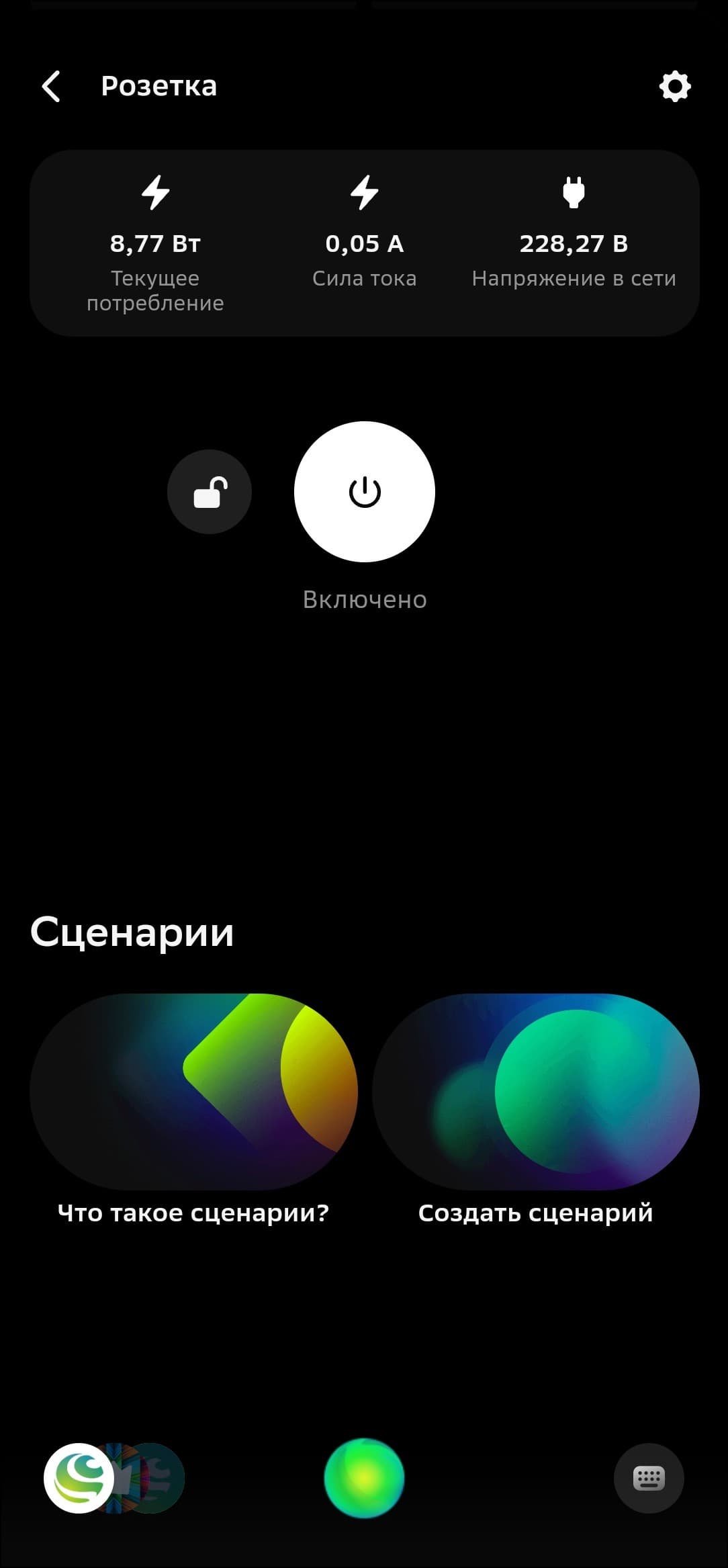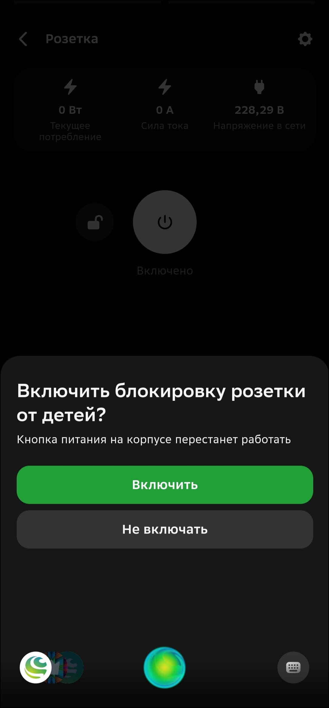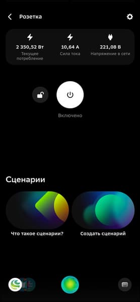 По центру главного экрана размещена кнопка включения и выключения, слева от нее — так называемая «блокировка от детей», выключающая кнопку питания на корпусе розетки. В верхней строке собраны данные о текущей нагрузке, напряжении в сети и так далее. На втором скриншоте к розетке подключена настольная лампа, на третьем — утюг. Показатели соответствующие. О том, сколько потребляет тот или иной прибор, можно узнать не только в приложении, но и от голосового помощника.