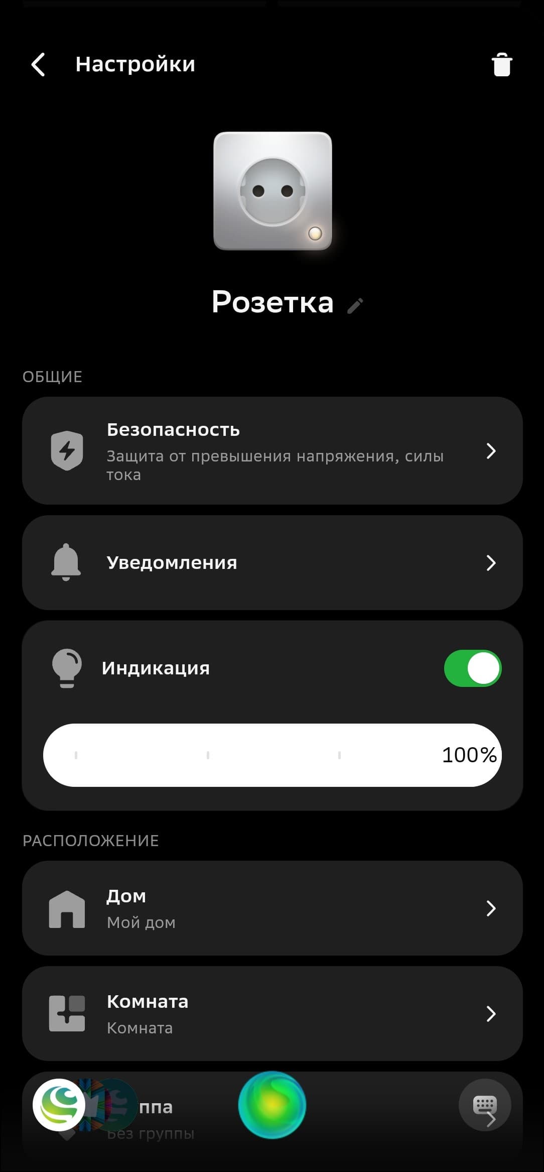 Под кнопкой на боковой поверхности розетки есть светодиодный индикатор включения, его яркость можно настроить из приложения, либо вообще его отключить. Пригодится, чтобы светодиод не мешал спать ночью, например.