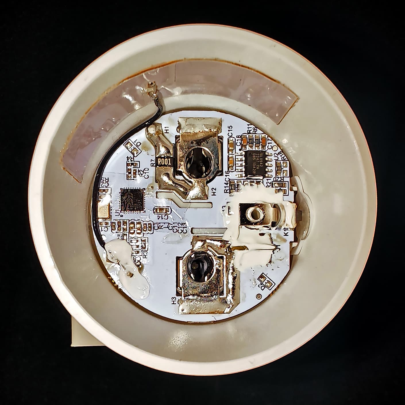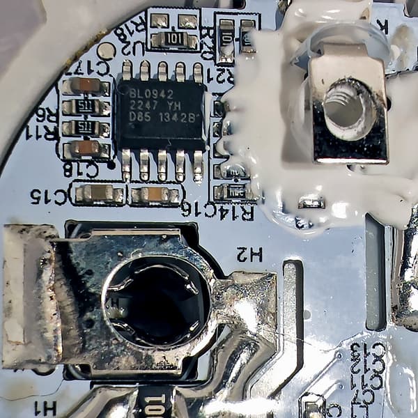 Верхняя часть розетки удерживается одним винтом и сравнительно легко извлекается из корпуса, давая доступ к внутренностям устройства. Контактные штифты распаяны непосредственно на плате, компоновка очень плотная. Ею разработчики гордятся особо, так как малые габариты розетки — одно из основных ее конкурентных преимуществ.