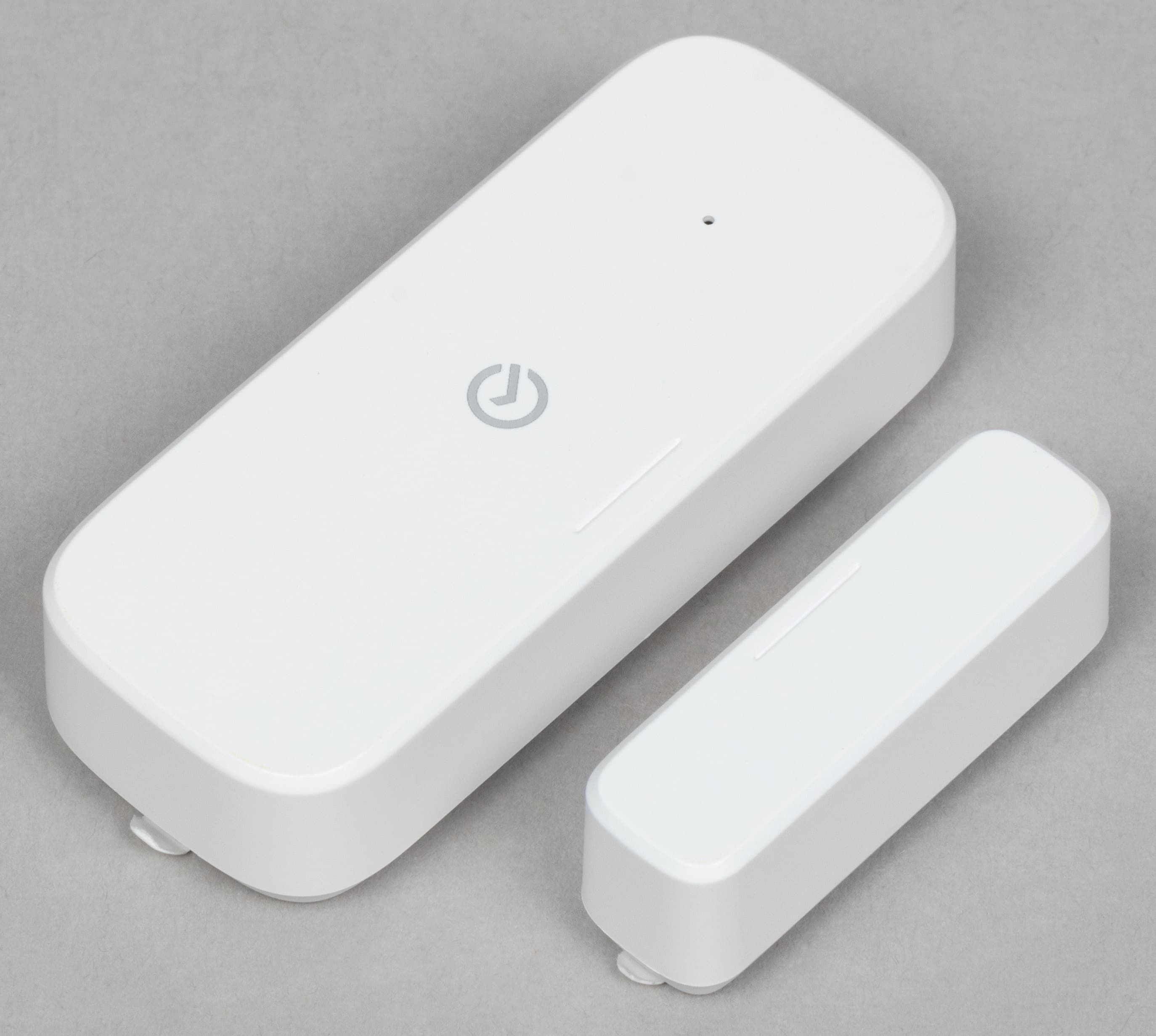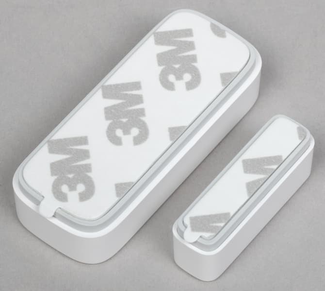 Датчик открытия выполнен в крайне компактном корпусе, состоит из двух элементов — непосредственно датчика и магнита, помещаемых на разные створки. На передней панели основного устройства размещен небольшой логотип производителя, выше которого виднеется отверстие светодиодного индикатора состояния.