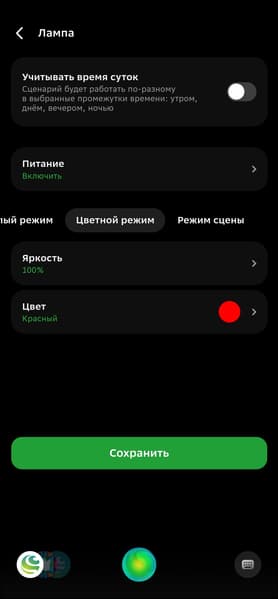 Сохраняем сценарий — проверяем. Лампа включается, сообщение поступает — всё отлично работает. Ложных срабатываний за несколько дней тестирования мы не заметили, заявленный угол обзора соответствует реальному.