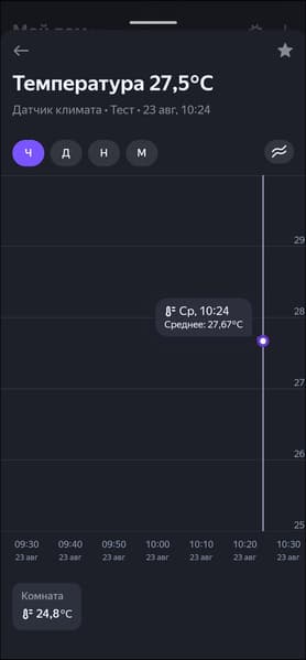 В приложении доступны текущие температура и влажность, а также динамика их изменения в виде графиков. Ну и, конечно, про «погоду в доме» можно спросить у голосового ассистента. Разработчики анонсировали повышенную скорость реакции датчика на изменение условий — мы попробовали нагревать и охлаждать его, данные меняются буквально на глазах, для бытового использования скорости обновления точно хватит.
