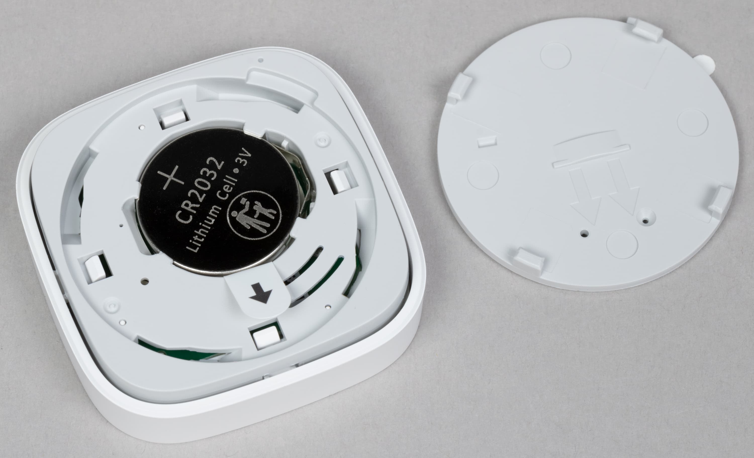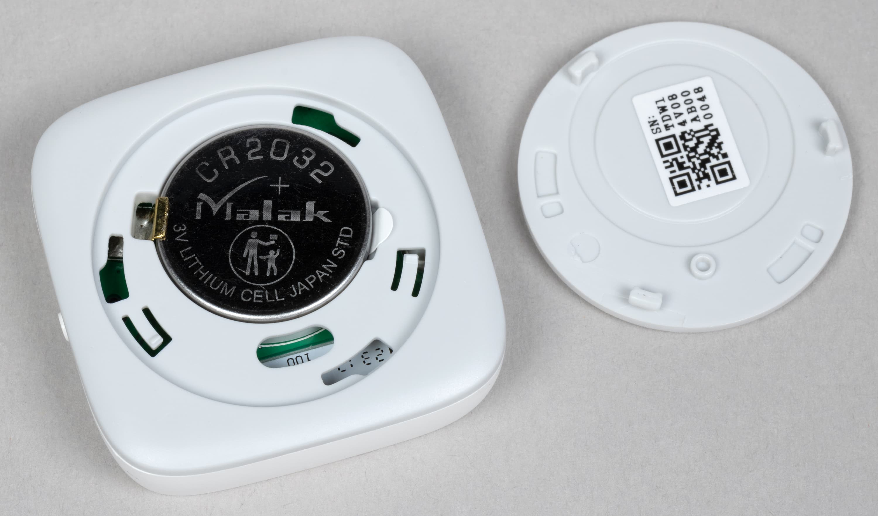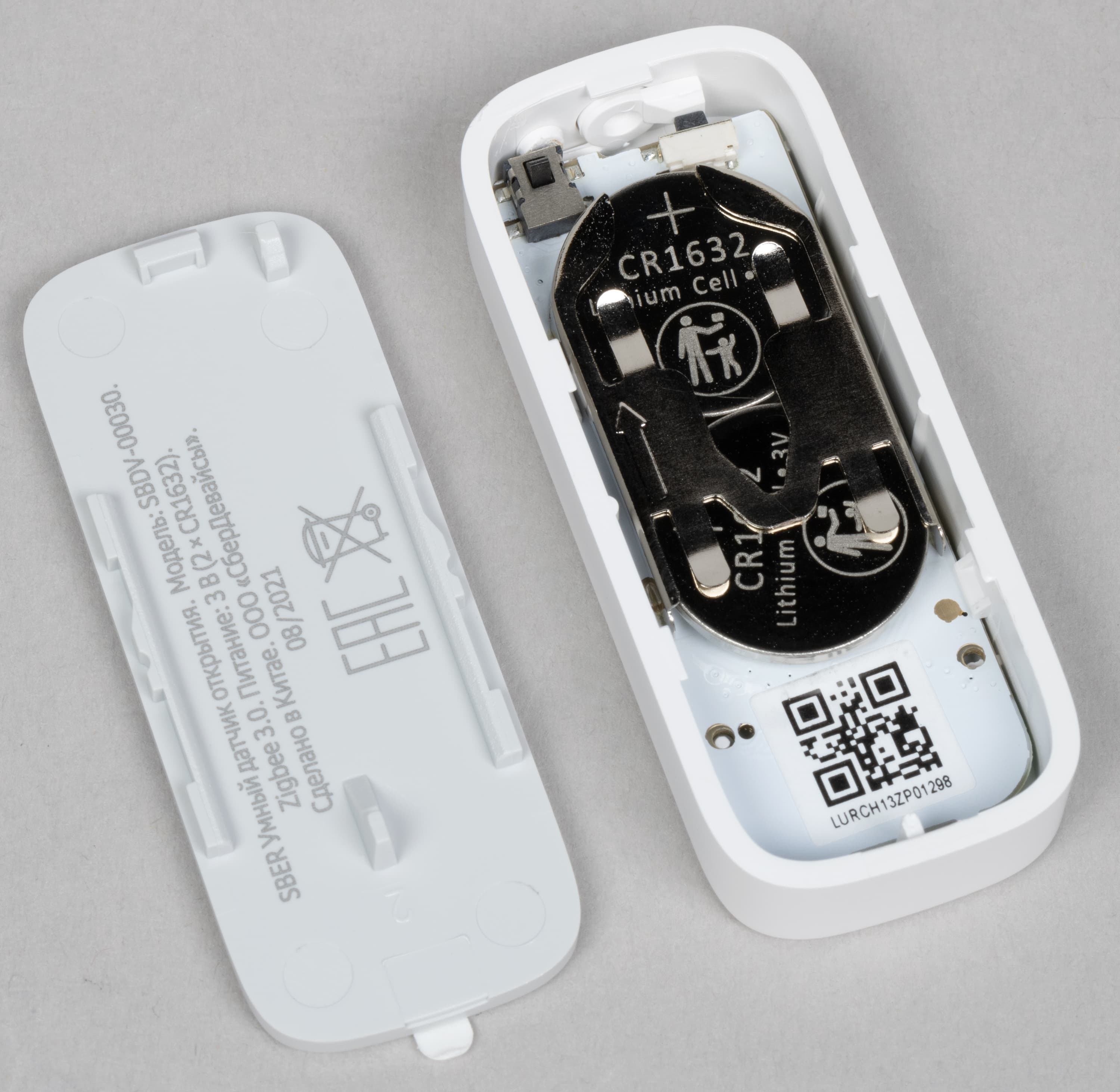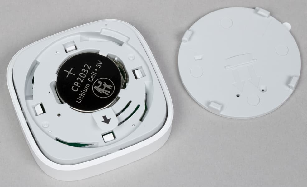 Поворачиваем крышку и снимаем, под ней видим элемент питания CR2032. Кстати, производитель анонсирует до 2 лет работы устройств без замены батарейки, но тут всё зависит от условий эксплуатации, конечно.