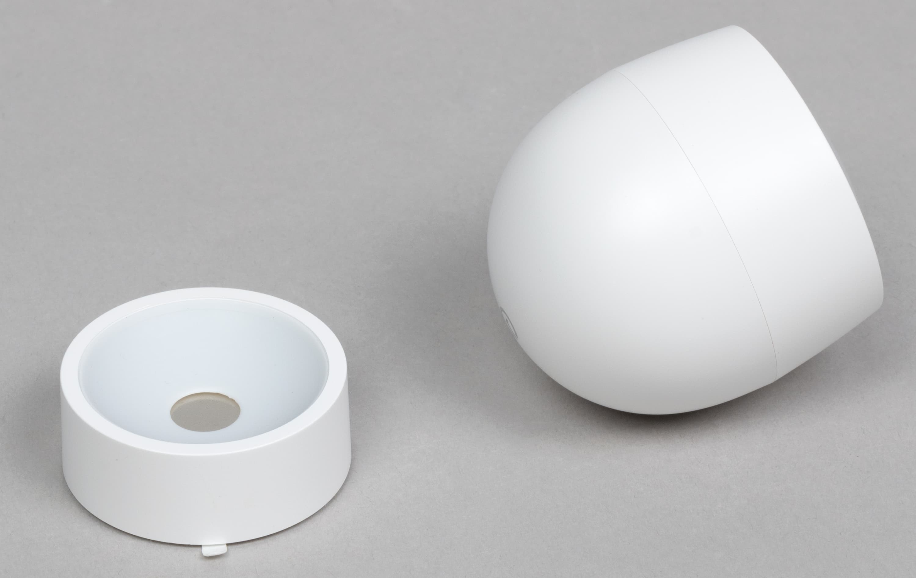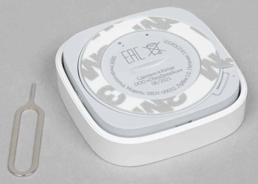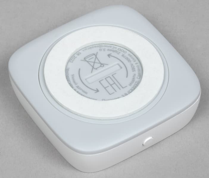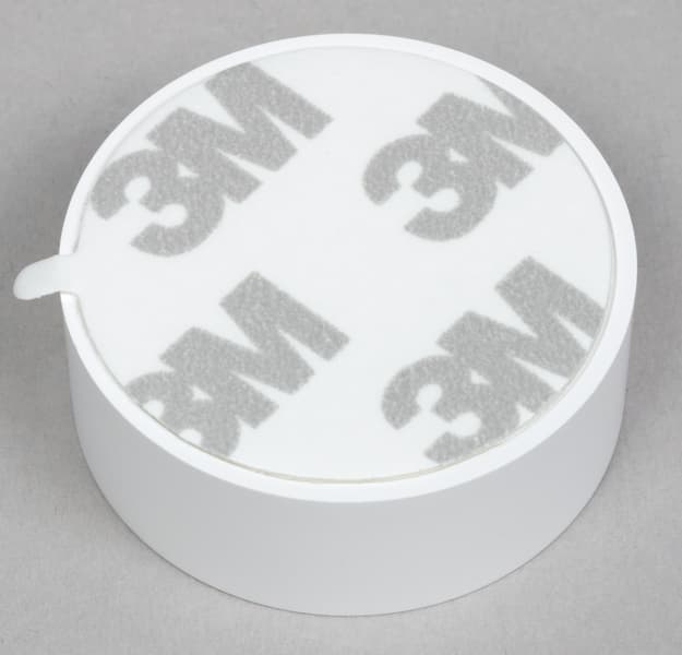 На дне устройства расположено кольцо из скотча, которое позволяет крепить его к разным поверхностям. За отверстием слева скрывается кнопка запуска сопряжения, нажимаемая с помощью «скрепки», которая идет в комплекте. Правое отверстие предназначено для небольшого светодиодного индикатора состояния.