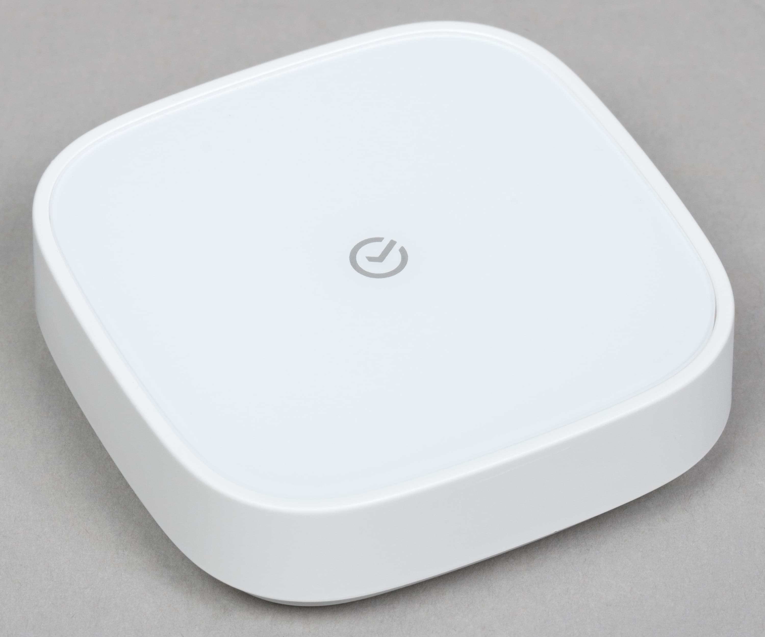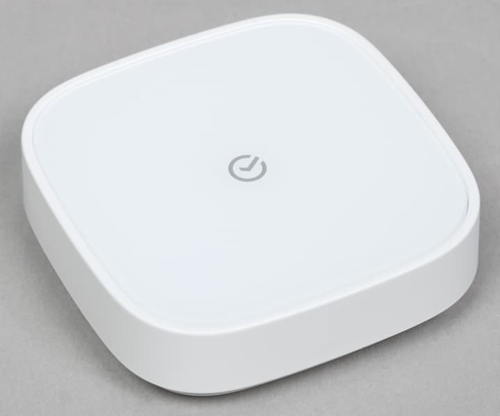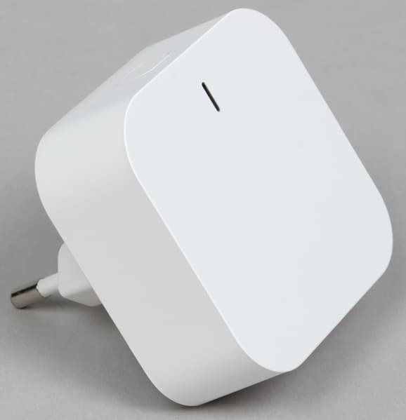 Для работы датчиков нам понадобится Zigbee-хаб. Это компактная белая коробка размером 56×56×54 мм вместе со штекером, которая подключается к розетке. Много места не займет, слишком бросаться в глаза не будет — вот и замечательно. На передней панели размещен светодиодный индикатор состояния.
