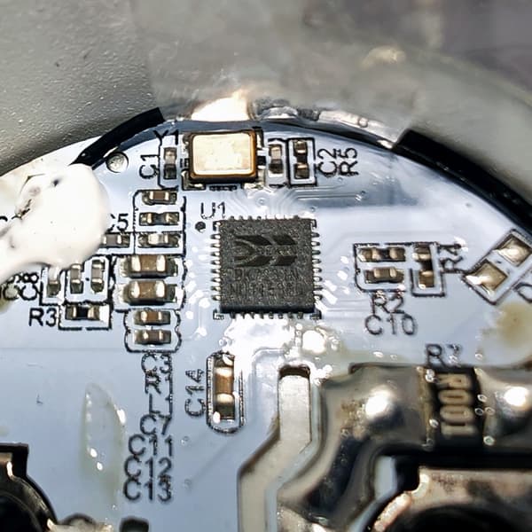 Верхняя часть корпуса снимается, под ней обнаруживаются элемент питания CR2450 и маленькая кнопка активации режима сопряжения.