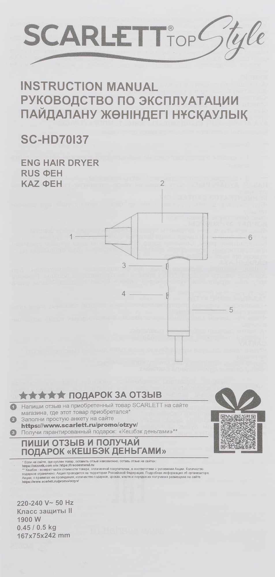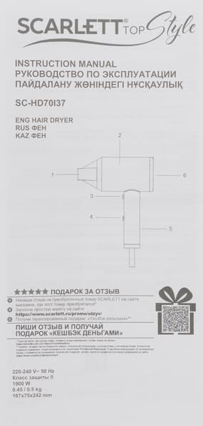 Инструкция для Scarlett SC-HD70I37 представлена в виде небольшого буклета, напечатанного на трех языках: русском, английском и казахском. Вся необходимая информация уместилась на листе А4 формата с двух сторон.