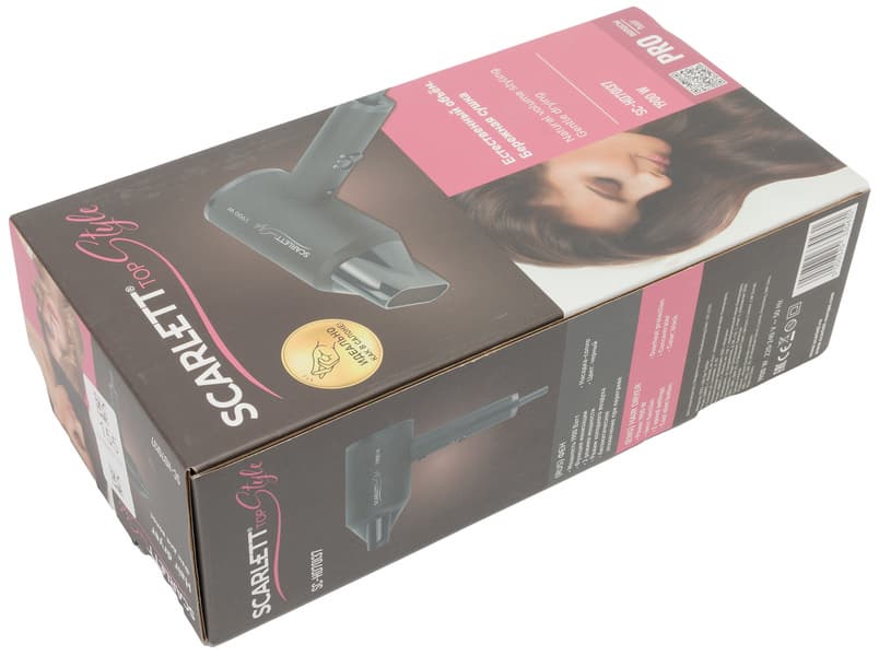 Scarlett SC-HD70I37 прибыл к нам в небольшой фирменной коробке из картона с качественной цветной полиграфией. На гранях упаковки размещены фотографии фена, логотип бренда, полное наименование модели, а также приведена информация об основных преимуществах устройства и его технических характеристиках.