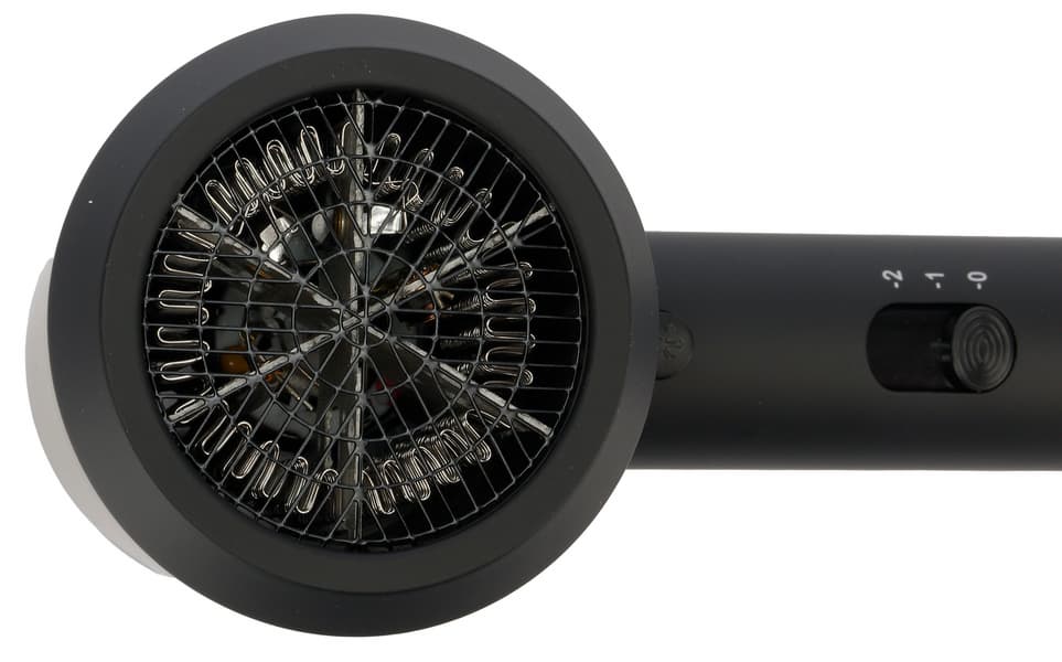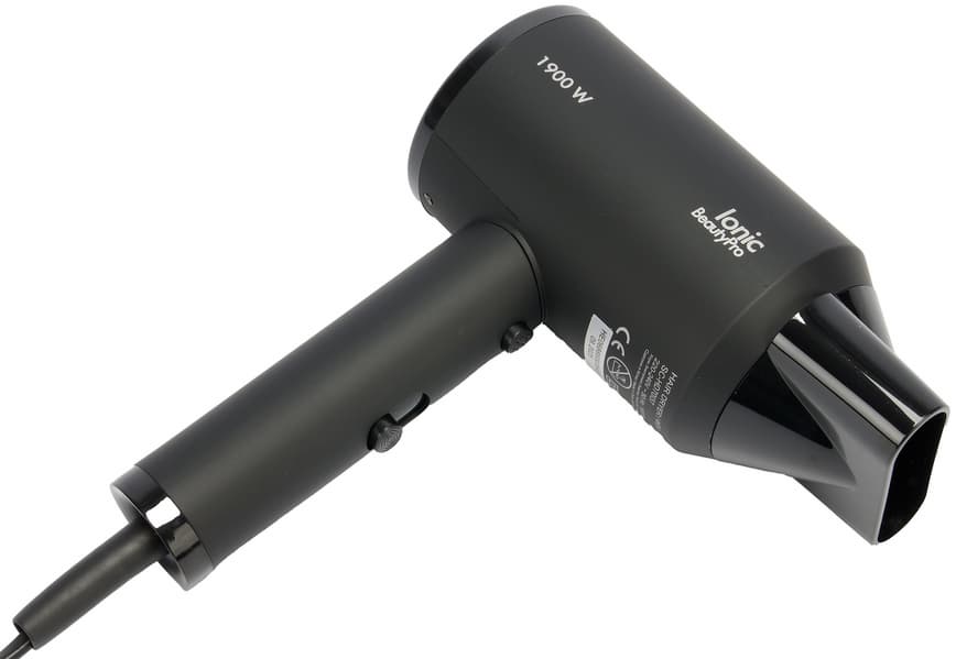 Элементы управления привычно расположены на рукоятке фена. Диаметр рукоятки составляет около 3,5 см, длина — 12,5 см. Крепление сетевого шнура длиной 1,8 м защищено от перегибов кожухом из резины средней плотности.
