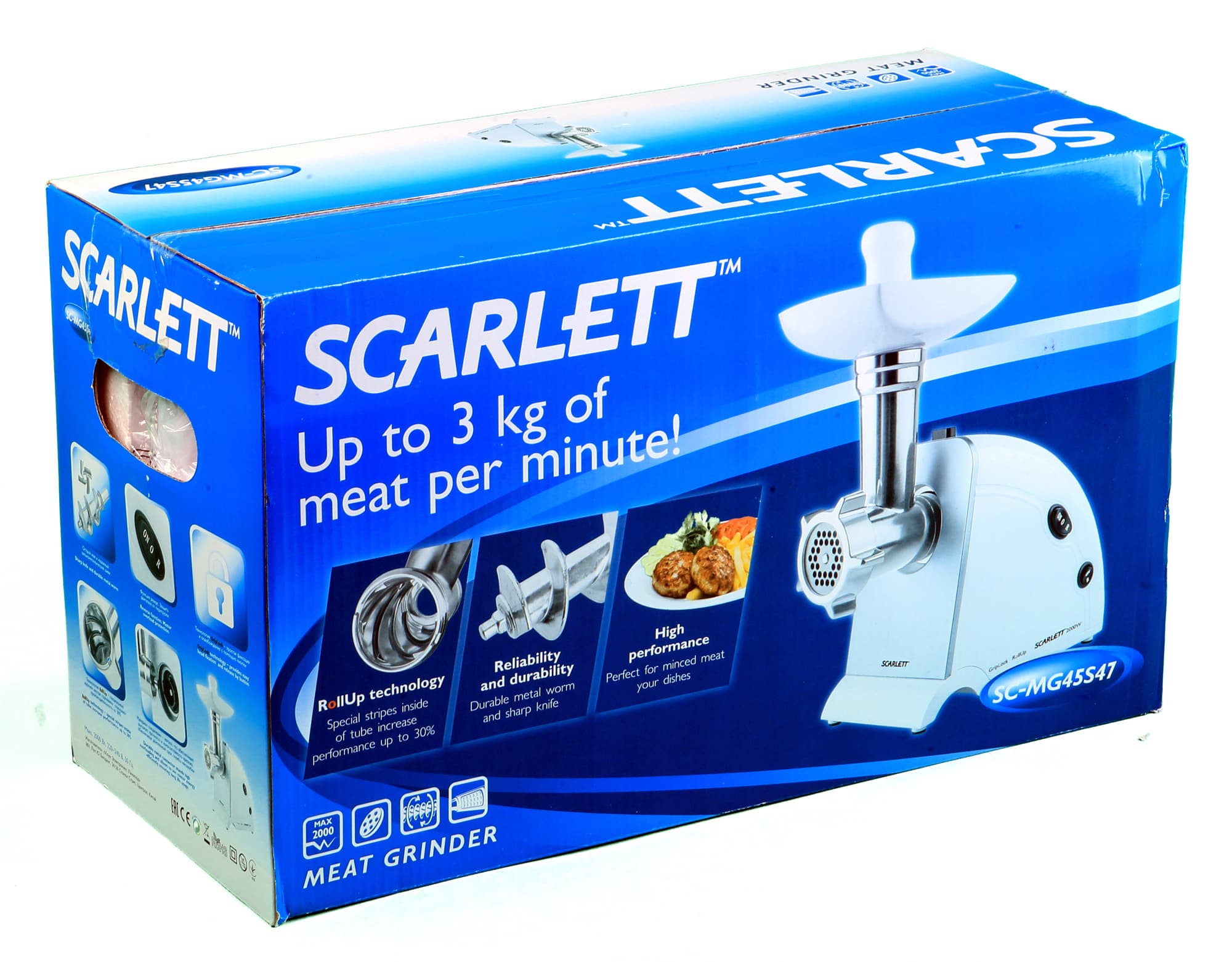 Мясорубка упакована в узкую коробку-параллелепипед. Для удобства переноски на боковых сторонах предусмотрены выемки для рук. В дизайне коробки использованы белый и синий цвета, а также оттенки голубого. Изучение информации, приведенной на упаковке, помогает составить впечатление об устройстве, его технических характеристиках и функциональных возможностях.