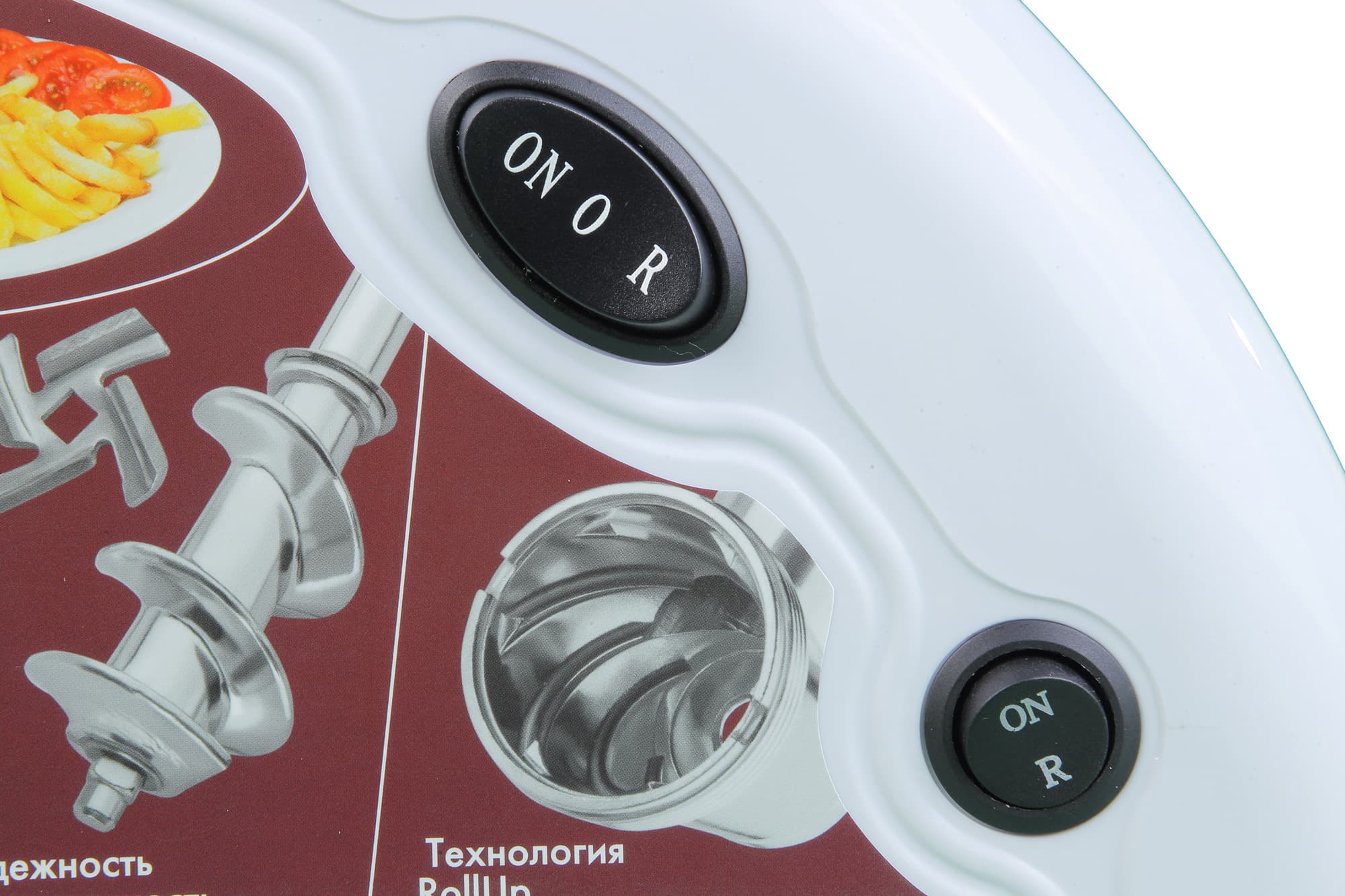 Итак, как мы уже отметили выше, в данной мясорубке можно выделить целую панель управления, которая представлена двумя кнопками-переключателями. Лишь изучение инструкции прояснило этот вопрос. Оказывается, нижняя кнопка — это переключатель двух положений On/R, а вторая — выключатель On/O/R. Мда, иногда полет китайской инженерной мысли не знает пределов. Или, может, так положено по феншую? Мы не знаем. Завершим нашу пятиминутку сарказма и глумления и более подробно расскажем, как управлять этим чудом конструкторской мысли.