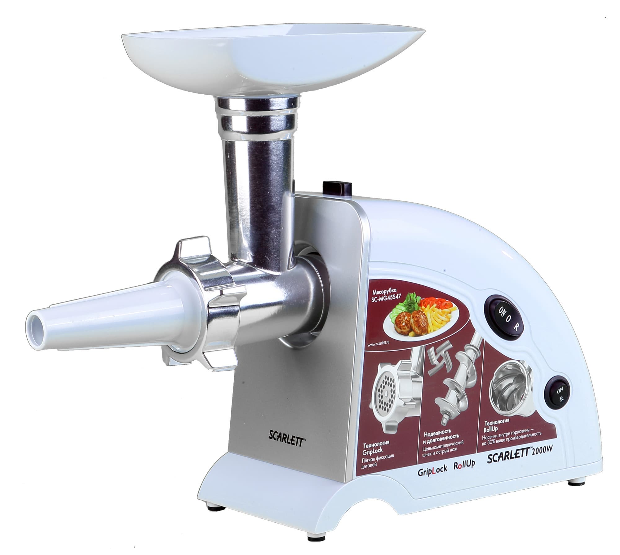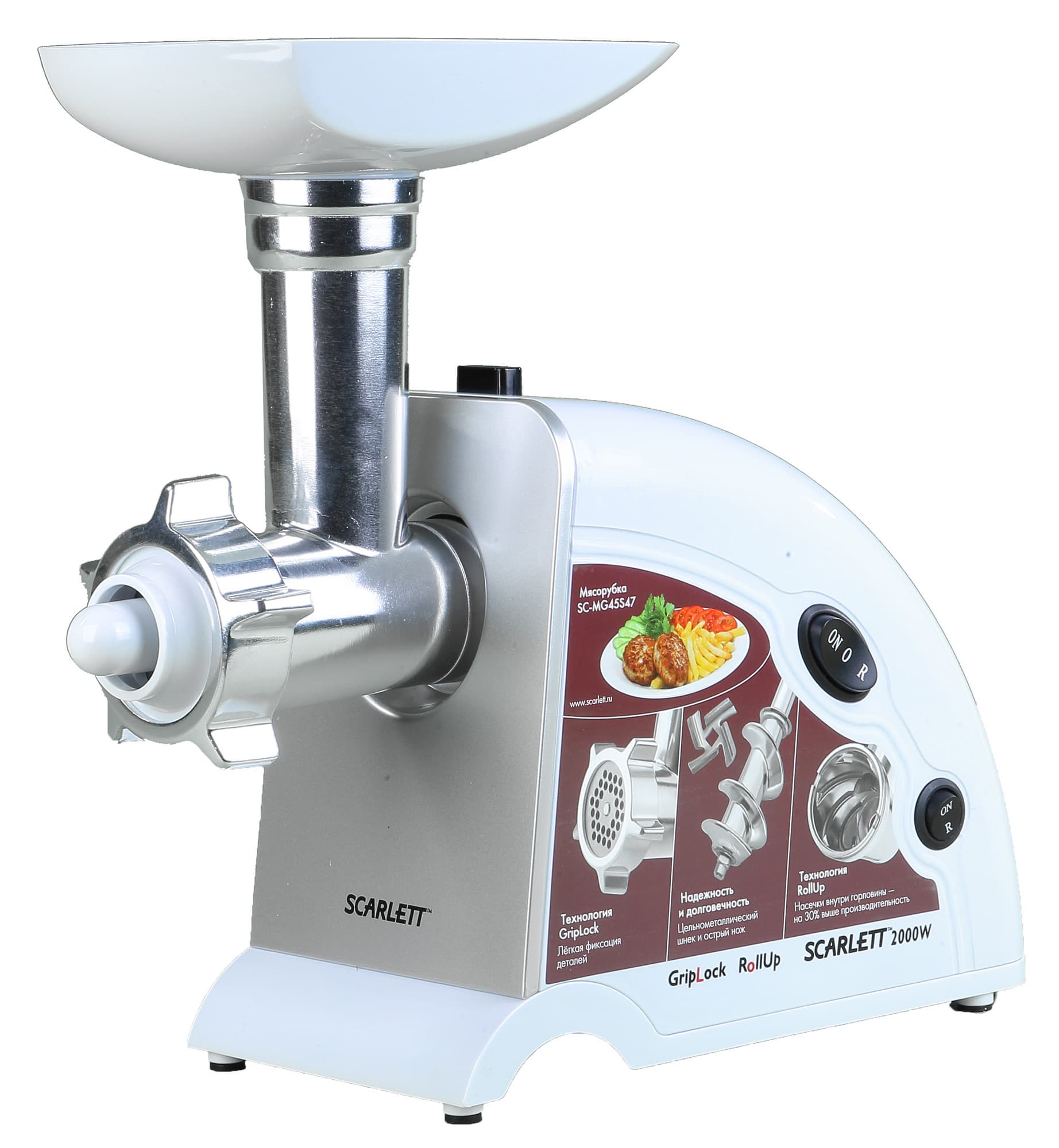 Внешний вид стандартен для большинства недорогих мясорубок. Электромотор прикрыт пластиковым корпусом белого цвета. Вес устройства, по ощущениям, невелик. Корпус имеет обтекаемую форму со скругленными углами. На первый взгляд форма кажется устойчивой. Длина шнура представляется достаточной для использования в обычной кухне. Сверху на корпусе имеется фиксатор съемного блока мясорубки. На лицевой стороне можно увидеть наклейку с описанием конструктивных особенностей данной модели. Здесь же расположены два переключателя: один с двумя положениями, другой — с тремя положениями кнопки. Для каких целей необходимы два переключателя, мы разберемся в главе, посвященной управлению данным прибором. Сейчас же эта особенность мясорубки Scarlett SC-MG-45S47 вызывает у нас лишь недоумение.