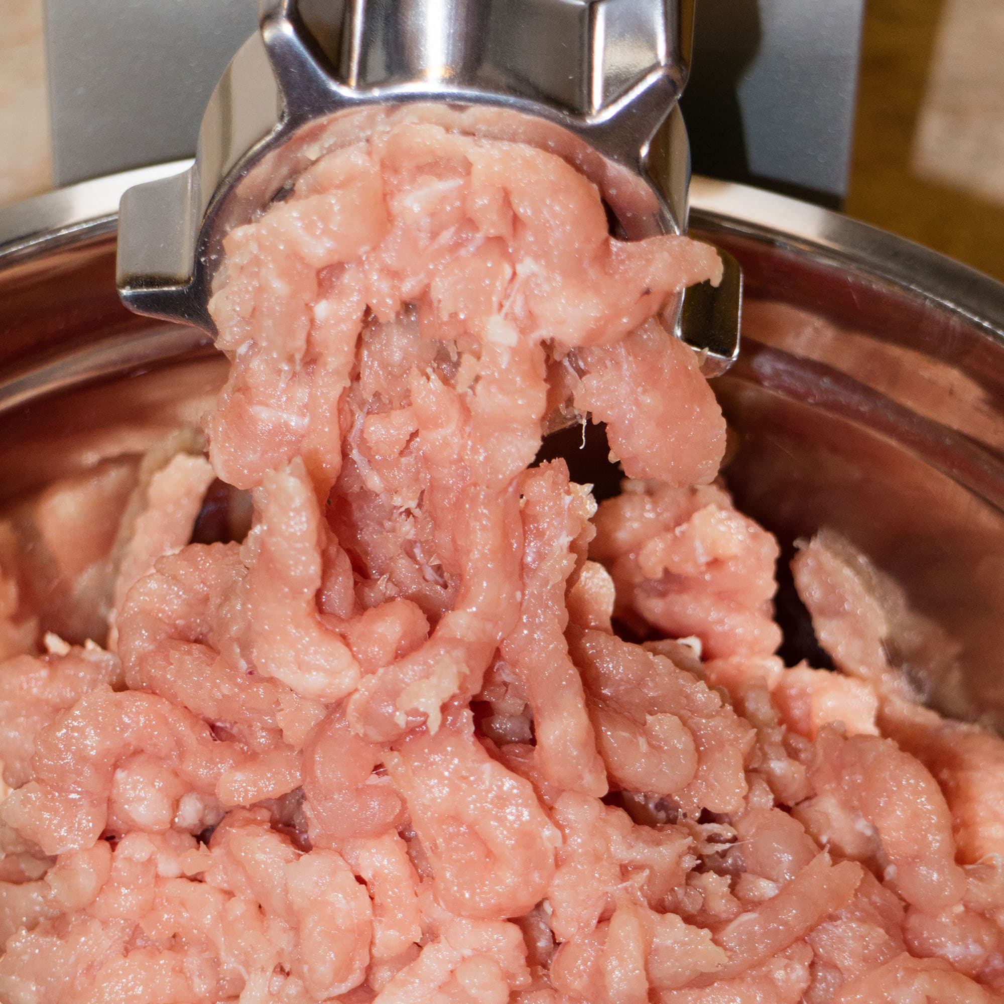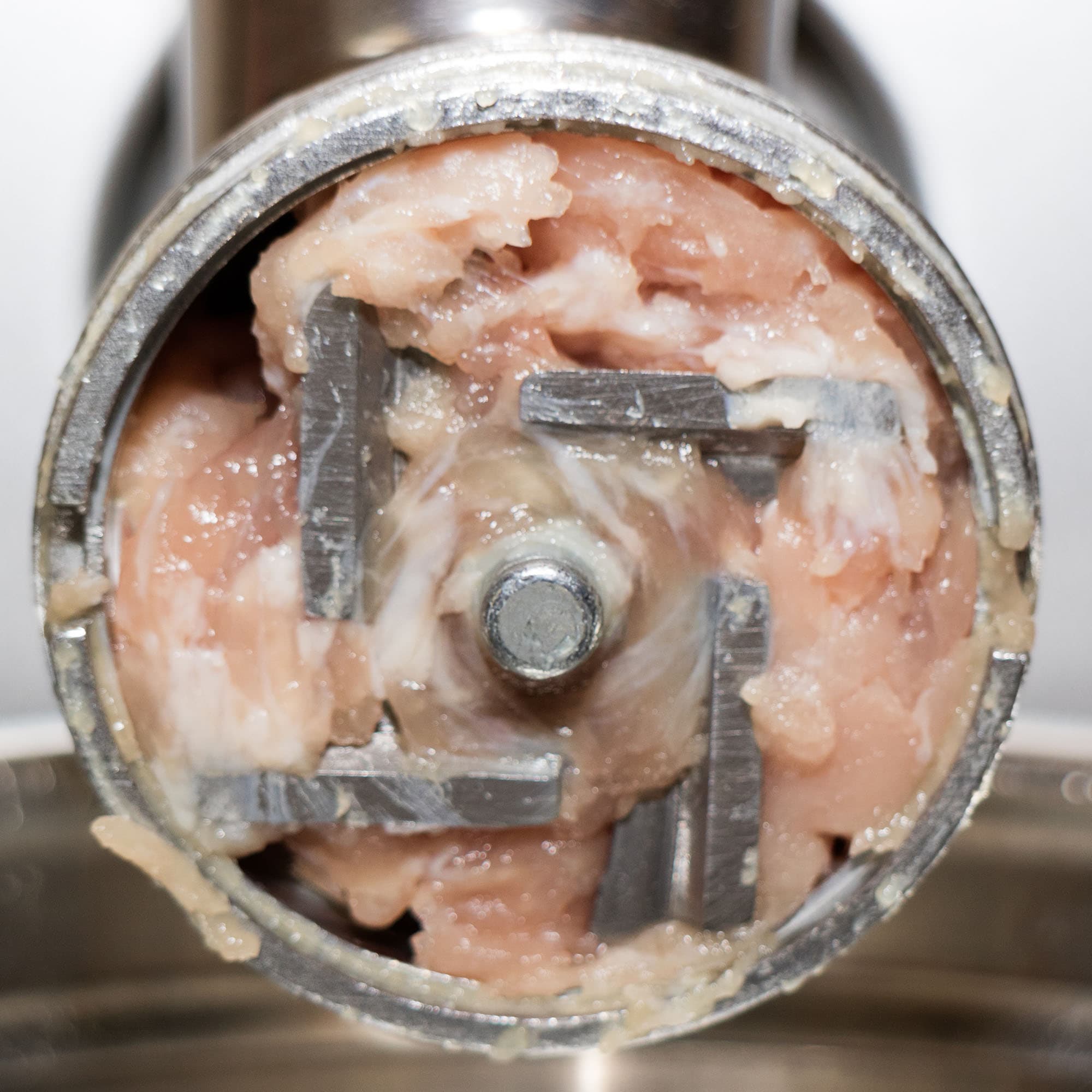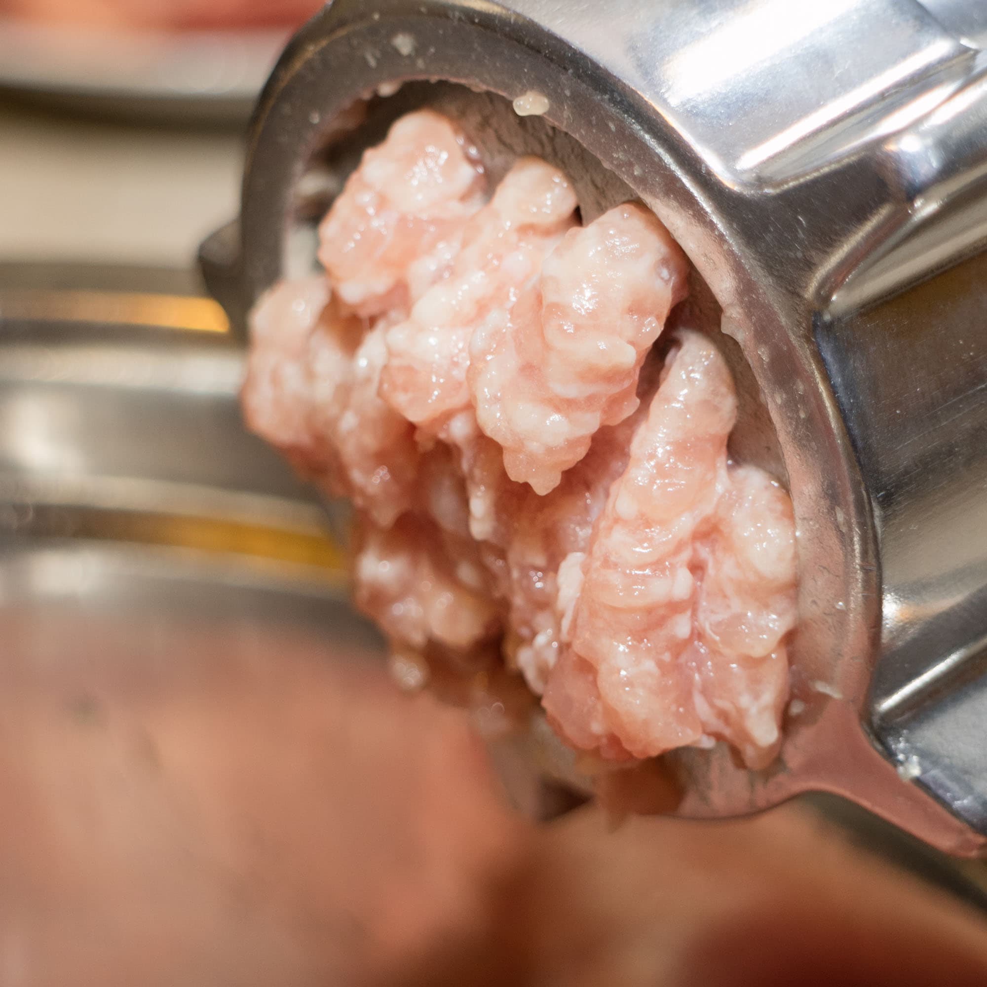 Для данного теста мы взяли обрезки от свиного окорока, содержащие большое количество сала и соединительной ткани. В целом, это стандартная задача — редко имеет смысл молоть фарш из хорошего куска постного мяса.