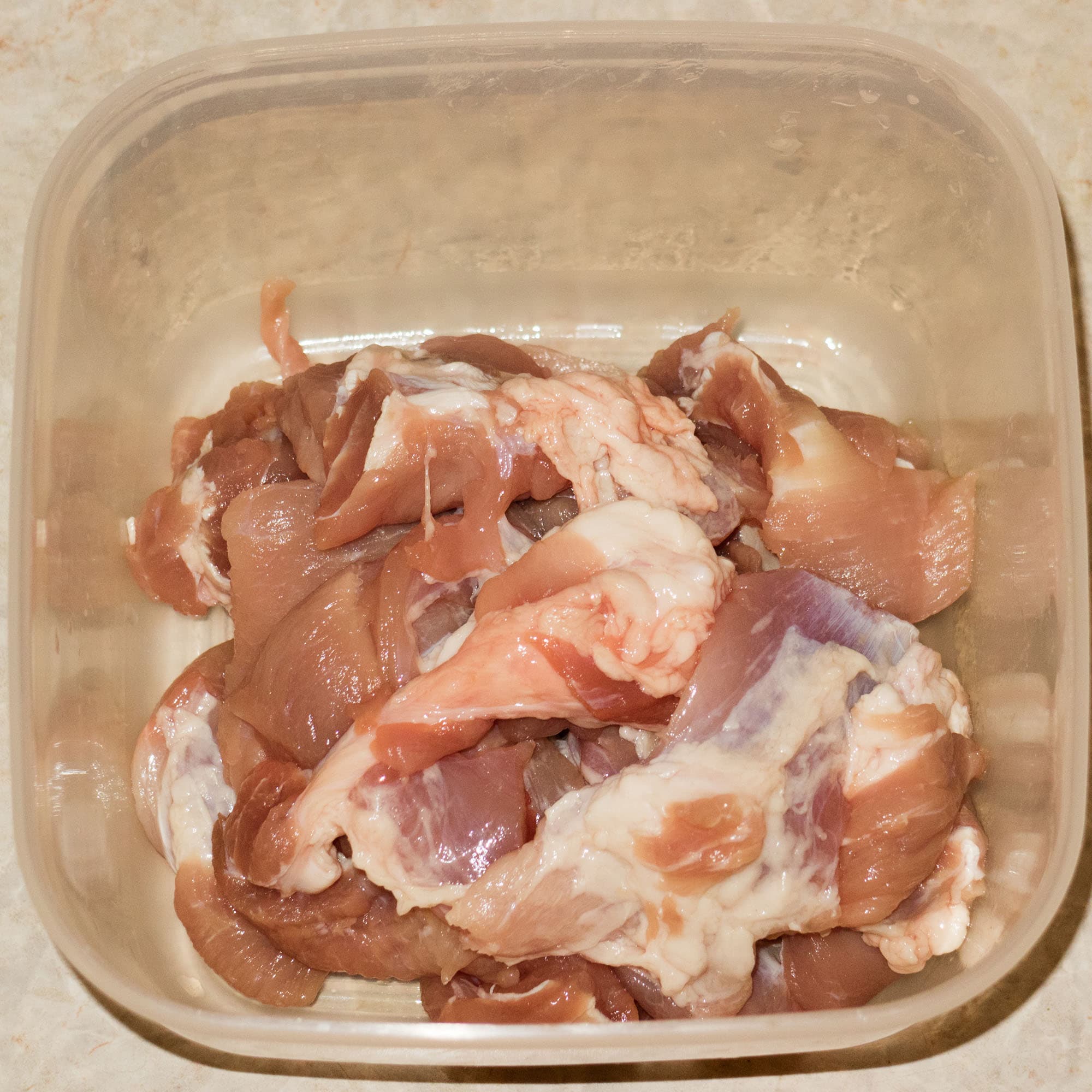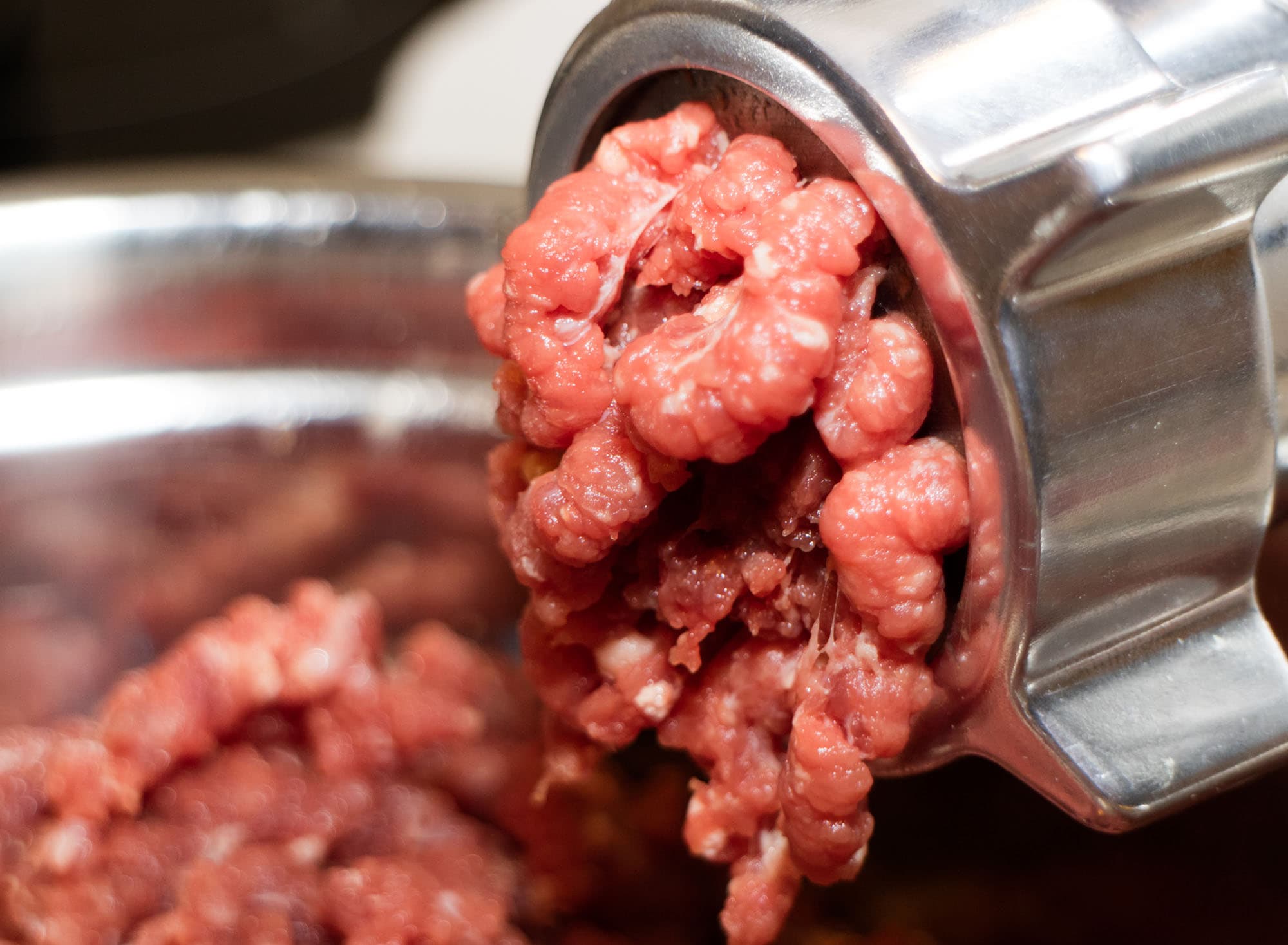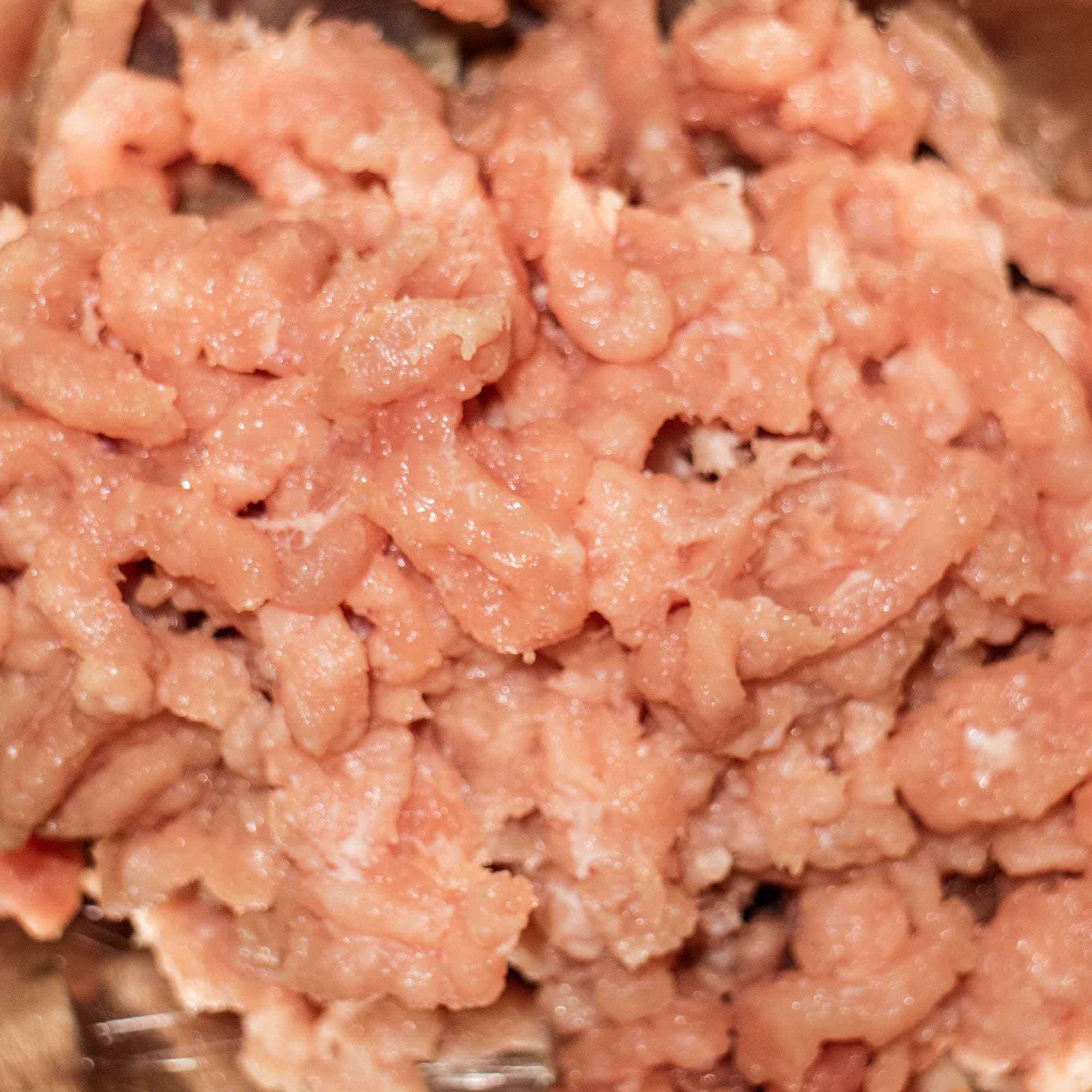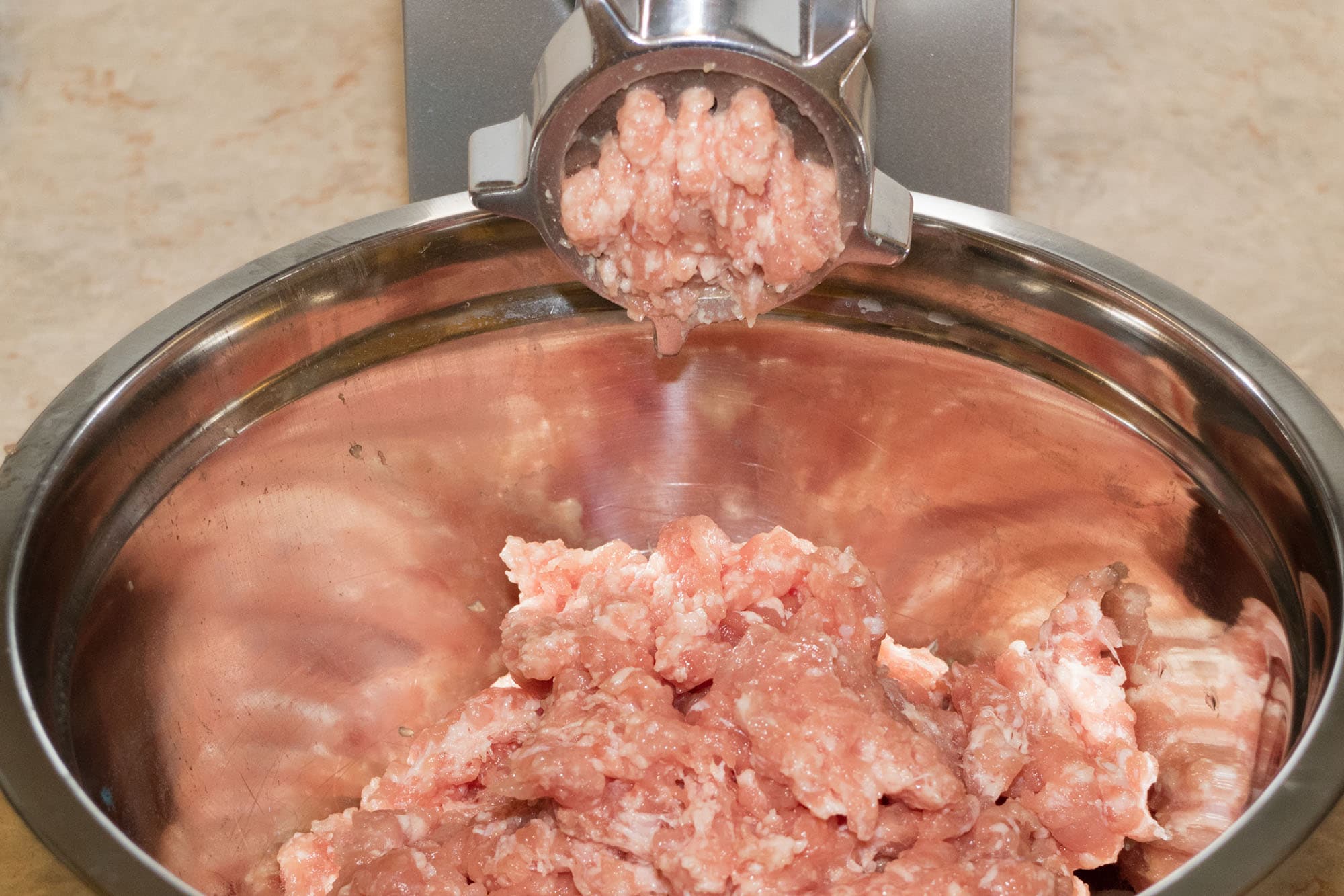 Для данного теста мы взяли обрезки от свиного окорока, содержащие большое количество сала и соединительной ткани. В целом, это стандартная задача — редко имеет смысл молоть фарш из хорошего куска постного мяса.