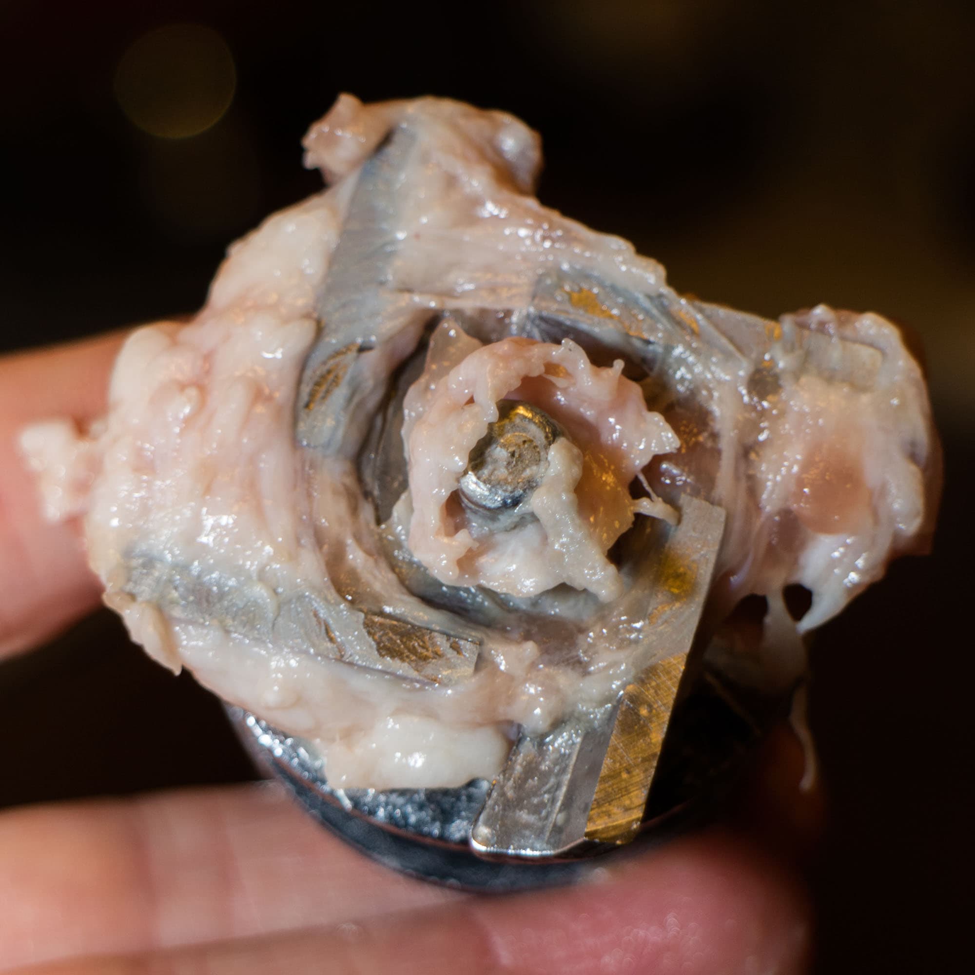 Шнек ожидаемо был обмотан кусочками жира и жилок: