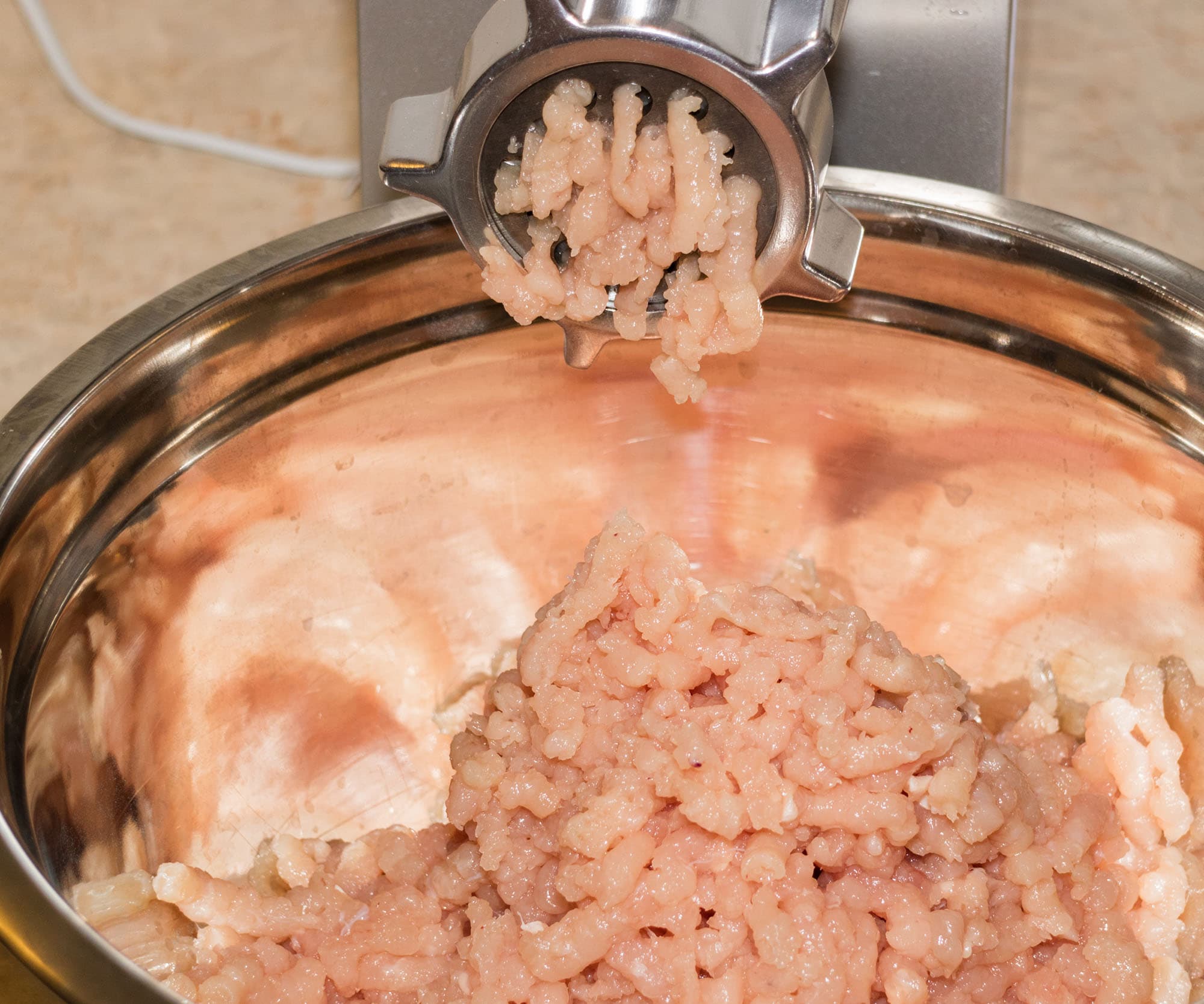 Для изготовления этого блюда мы использовали обесшкуренное мясо грудок курицы. Для переработки 630 г сырья мясорубке потребовалась 31 секунда. С перемалыванием такого типа сырья мясорубка справилась чуть получше, чем со свиной и говядиной. Хотя рубленым получившийся фарш назвать никак нельзя.
