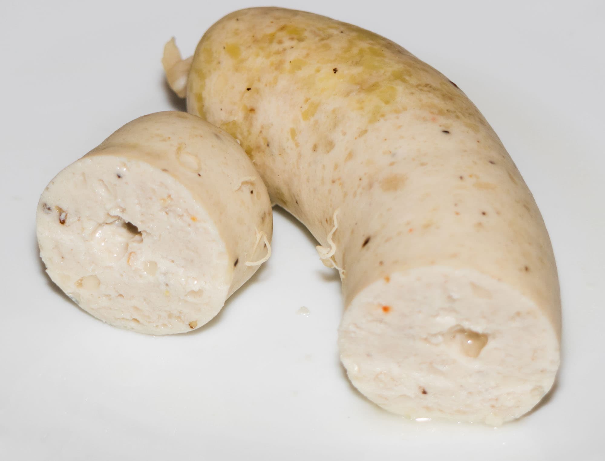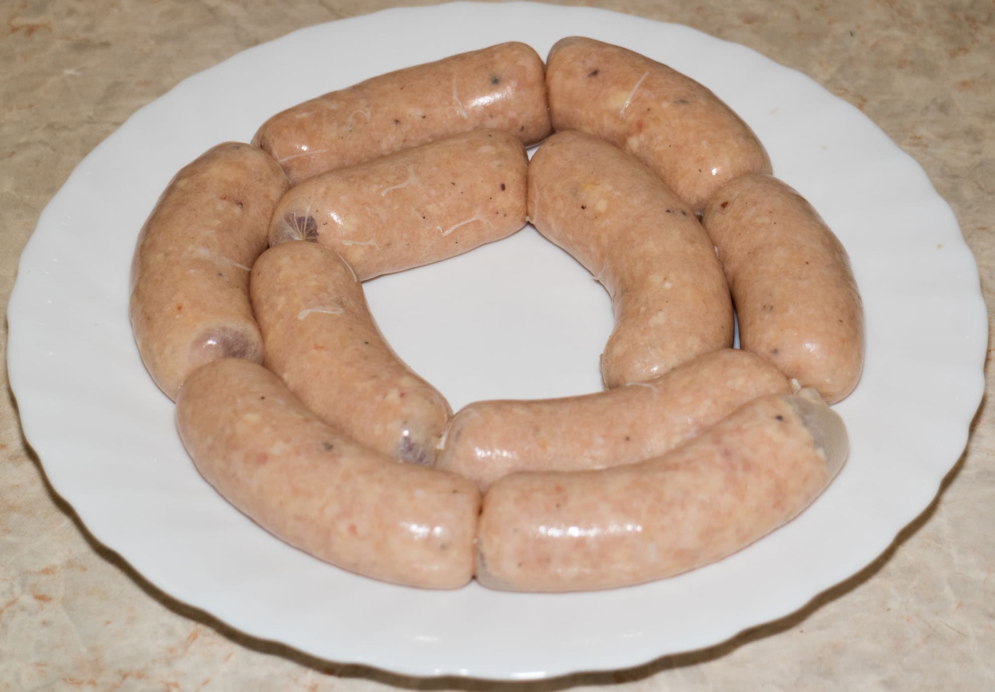 Однако идея сделать нежные сардельки с яркими всполохами сырного вкуса потерпела фиаско. Поскольку при изготовлении колбасок фарш повторно измельчается и проходит сквозь ножи и решетки в коническую насадку, все наши любовно и старательно нарезанные кусочки сыра смялись с куриным фаршем в равномерную бесцветную массу.