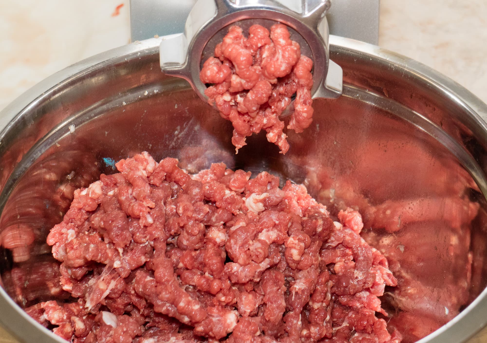 Жилистая говядина с большим количеством соединительной ткани не подвергалась заморозке и имела температуру чуть ниже комнатной. Мясо было нарезано на куски, свободно помещающиеся в горловине мясорубки.