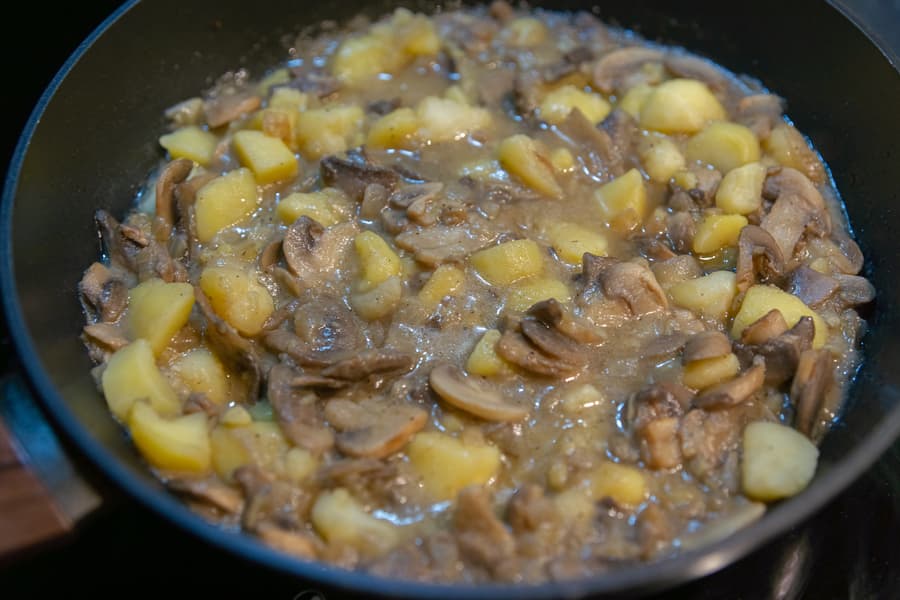 Нарезанный кубиками картофель поставили вариться, а в этом время обжарили лук и шампиньоны. Готовую картошку вместе с небольшим количеством воды, в которой она варилась добавили в сковородку к луку и грибам. Посыпали солью, перцем, перемешали, закрыли крышку и оставили на 5 минут на медленном огне.