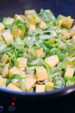 Нарезанный кольцами лук-порей обжарили на сливочном масле до мягкости. Картофель кубиками сначала отправили в сковородку к луку обжариваться, затем залили всё горячим куриным бульоном, поперчили, посолили и оставили вариться примерно минут на 20, до полной готовности картошки.
