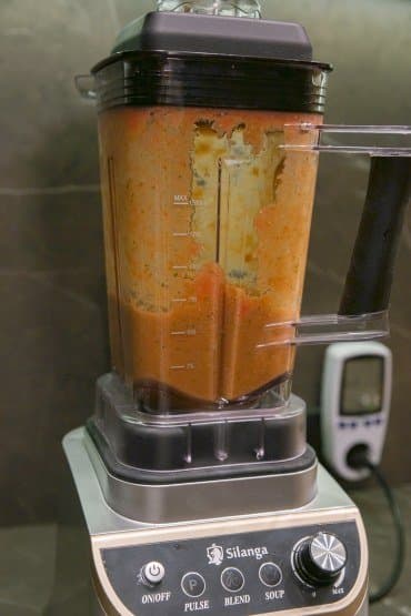 Включили режим Soup. Блендер зашумел и принялся измельчать — судя по звуку, это была 5-я скорость. Пару раз, с промежутком примерно в 2,5 минуты, блендер стихал секунд на 10 и потом по нарастающей снова начинал работать на максимальной скорости. Кувшин заметно нагревался. Через 7 минут прибор остановился.