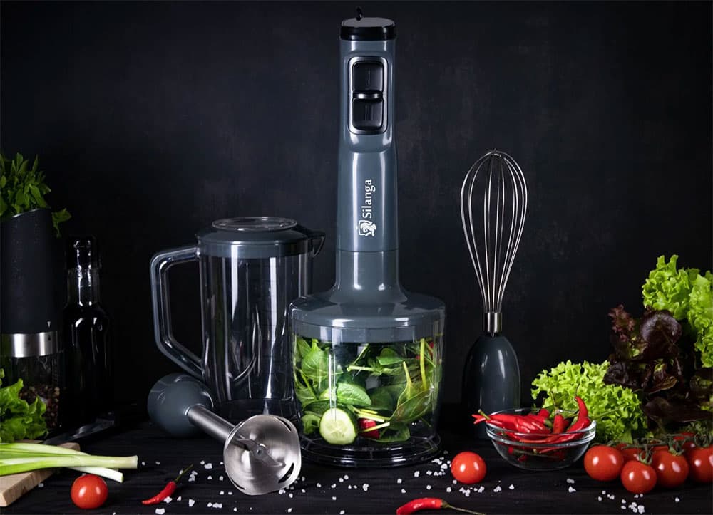 Погружной блендер Silanga BL800 Universal оснащен стандартной для устройств типа «три-в-одном» комплектацией: моторный блок, стакан для измельчения и взбивания, измельчитель и две насадки — для блендирования и венчик для взбивания. Ничего особенного. Однако, по словам производителя, в приборе установлен японский двигатель с защитой от перегрева D-safe, емкости изготовлены из американского материала Tritan (BPA free), а ножи — из нержавеющей японской стали X-blade 2.0. Не знаем, что означает «2.0», но звучит впечатляюще.