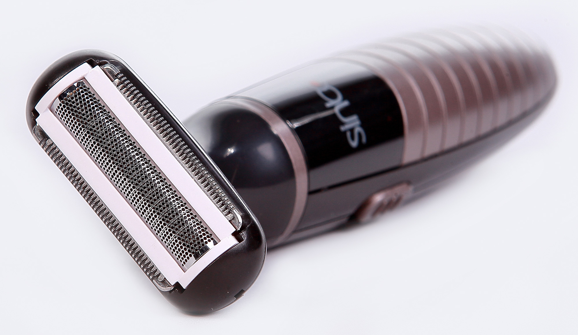 Основная насадка имеет в середине довольно небольшую сетку, а по бокам — два ножа триммерного типа. В этом режиме, по замыслу производителя, она должна работать как обычная сеточная электробритва: ножи-триммеры состригают длинную щетину, а сеточный нож — получившуюся короткую.
