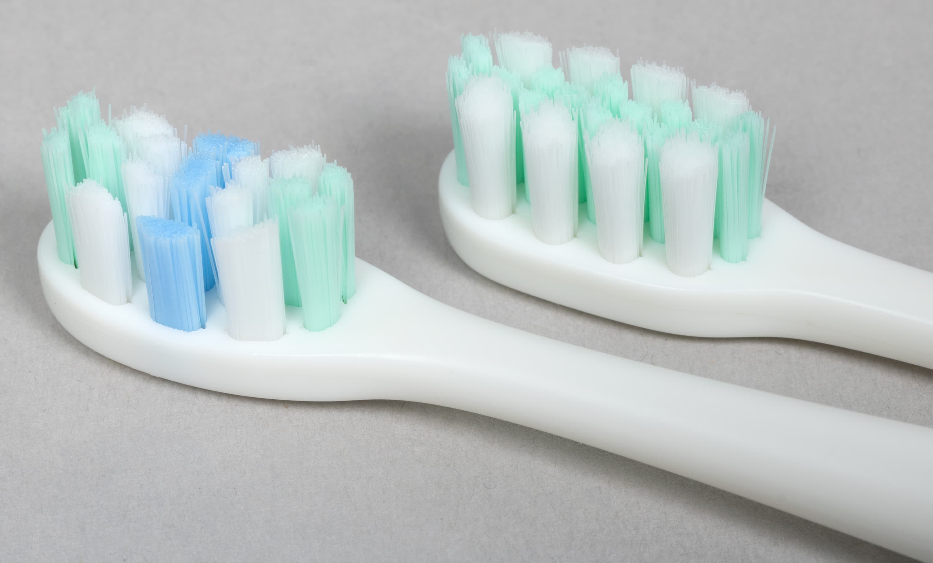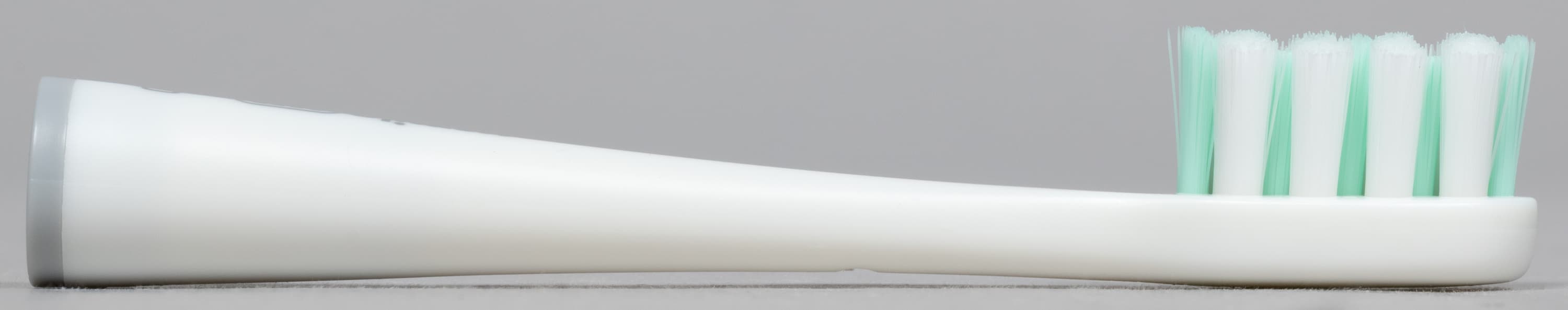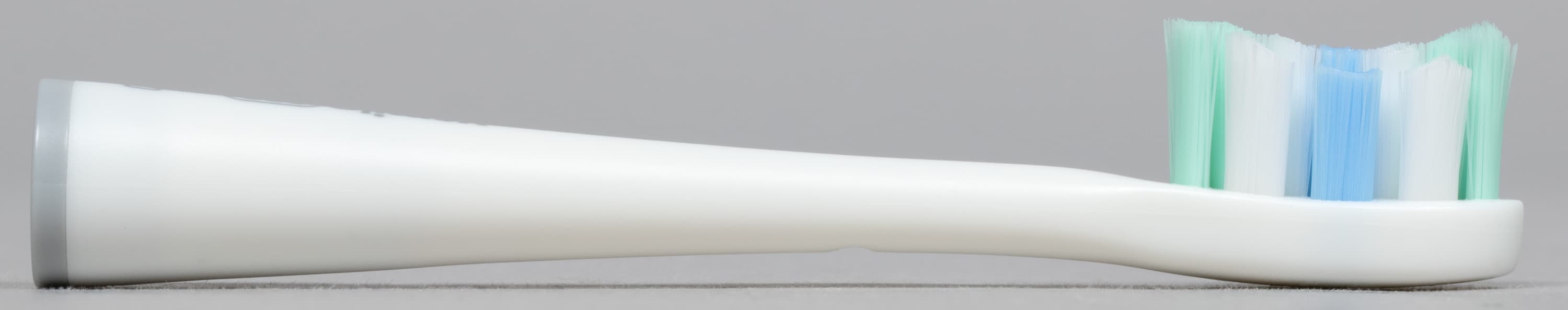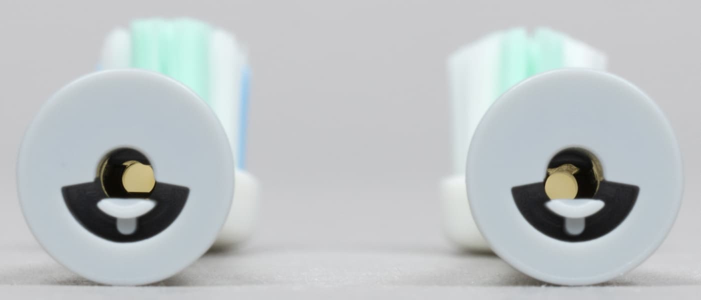 Геометрия пучков у оказалась различной. Помимо этого насадки можно различить по цвету щетины: у мягкой она бело-зеленая, у среднежесткой — с добавлением голубого. Никаких электронных приспособлений, вроде микрочипов, определяющих «пробег», у насадок нет. Время замены производитель рекомендует определять по обесцвечиванию волосков.