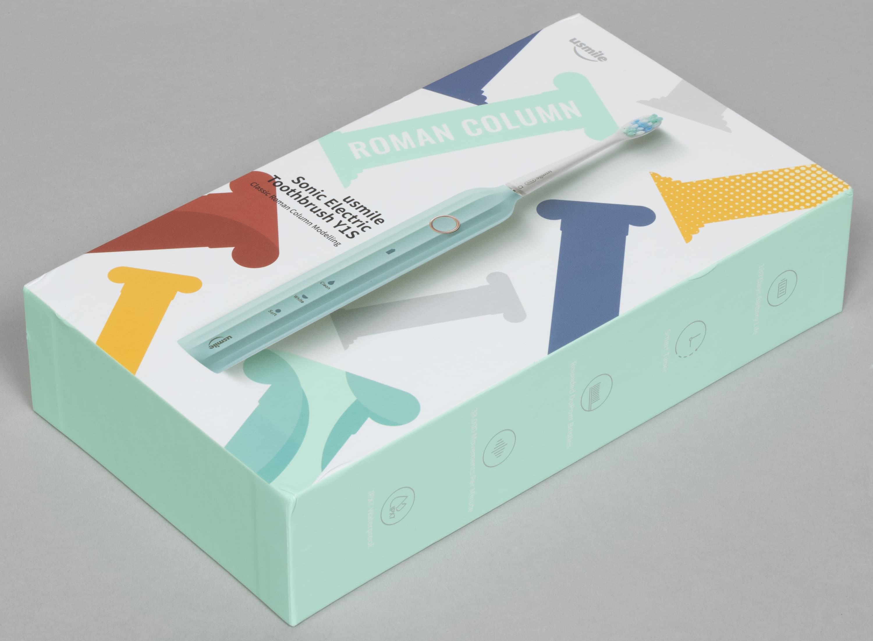 Зубная щетка упакована в стильную картонную коробку мятного цвета. Дизайн стильный: на верхней крышке мы видим логотип производителя, изображение устройства с названием модели, а также множество римских колонн. Именно ими вдохновлялись дизайнеры, придумывая внешний вид зубной щетки.