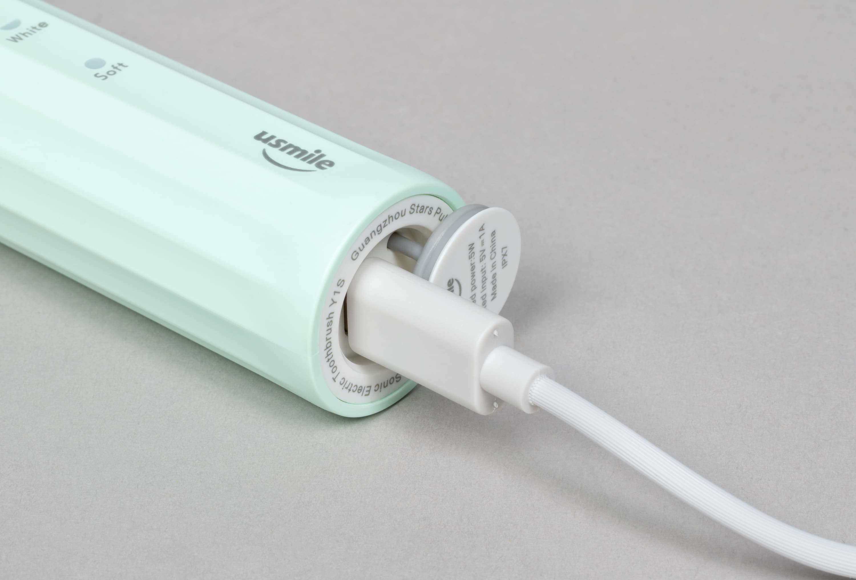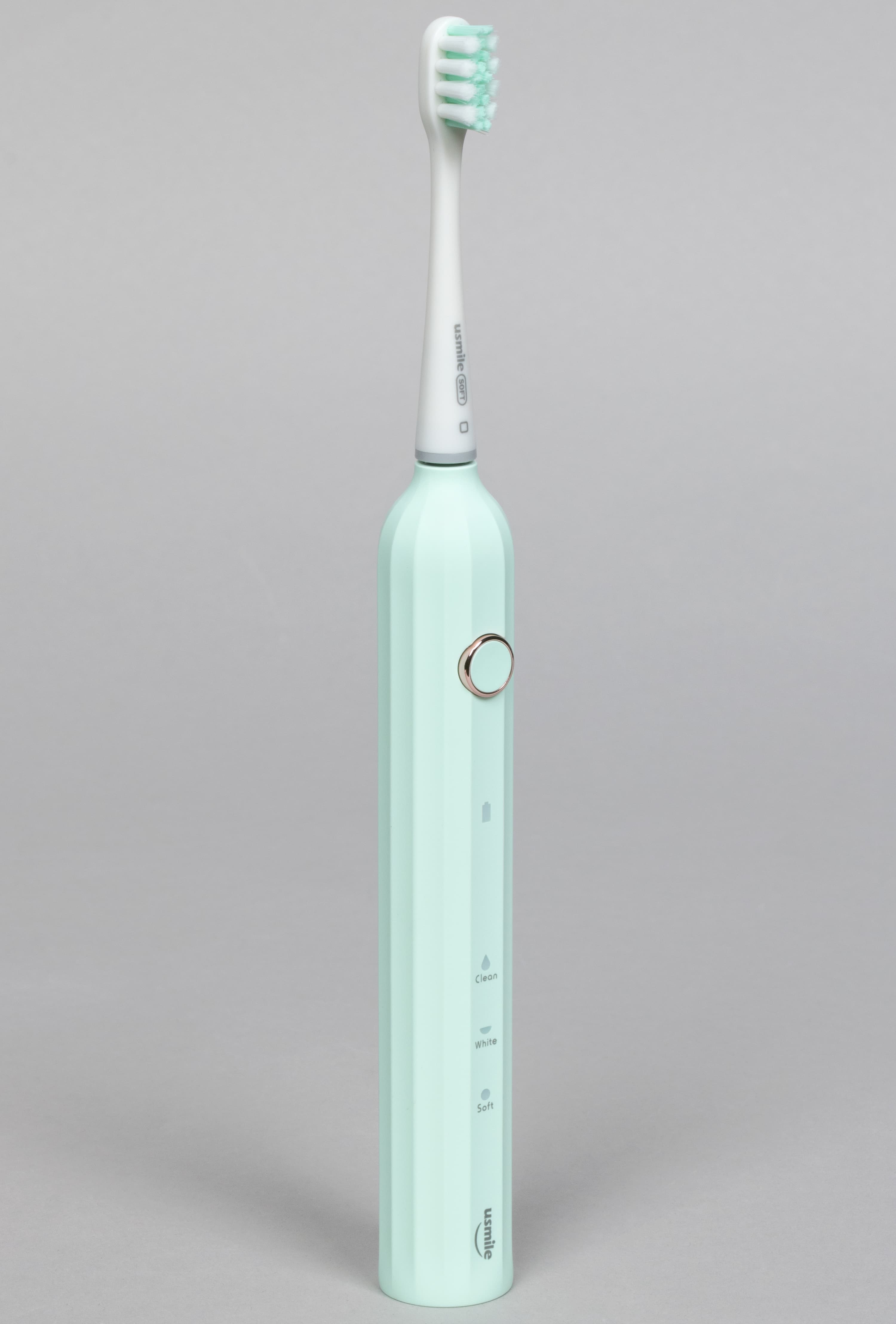 Спереди мы видим кнопку, включающую прибор, а под ней — индикатор заряда, три индикатора режимов работы и, в самом низу, логотип usmile.