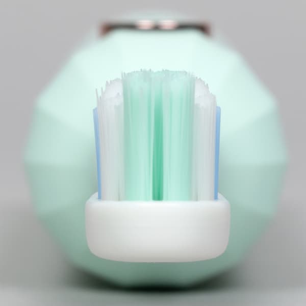 Пластик оказался очень приятным как на ощупь, так и визуально. Благодаря граням на корпусе (напомним, дизайнеры вдохновлялись древнеримскими колоннами) зубную щетку удобно держать: она не выскользнет даже из мокрых рук. При этом щетку можно направлять в любую сторону — специальной зоны захвата тут не предусмотрено.