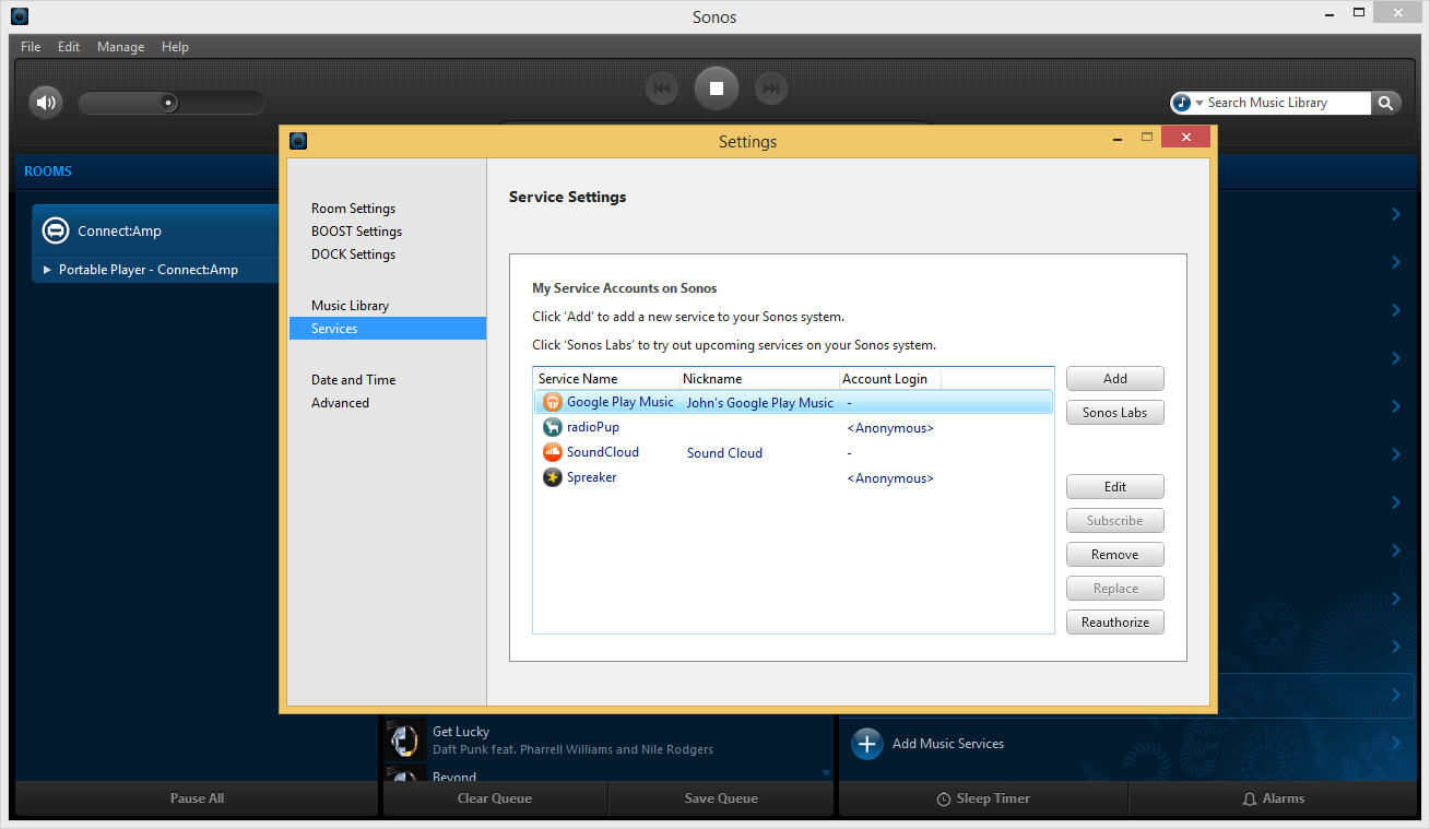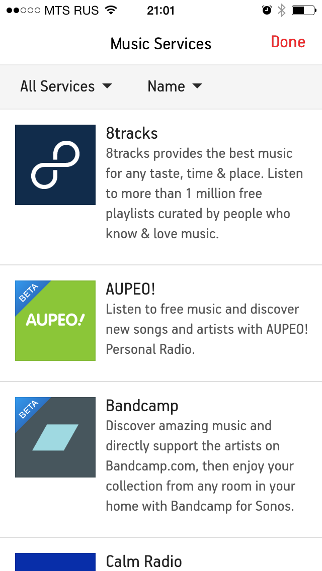 По умолчанию в системе присутствует популярный каталог интернет-радиостанций TuneIn. Отметим, что пользователь имеет возможность добавлять в него свои станции, указывая название и ссылку на трансляцию аудиопотока. В самой программе указан немного отличающийся от информации на сайте список сервисов, который, видимо, отфильтрован по доступности (в частности, отсутствуют неработающие у нас Pandora и Spotify). Подавляющее большинство из них требуют регистрации и создания аккаунта, а многие — и абонентской платы. Среди наиболее известных упомянем Google Play Music, Last.fm и SoundCloud. В разделе Sonos Labs можно найти еще несколько сервисов, поддержка которых имеет статус «беты».