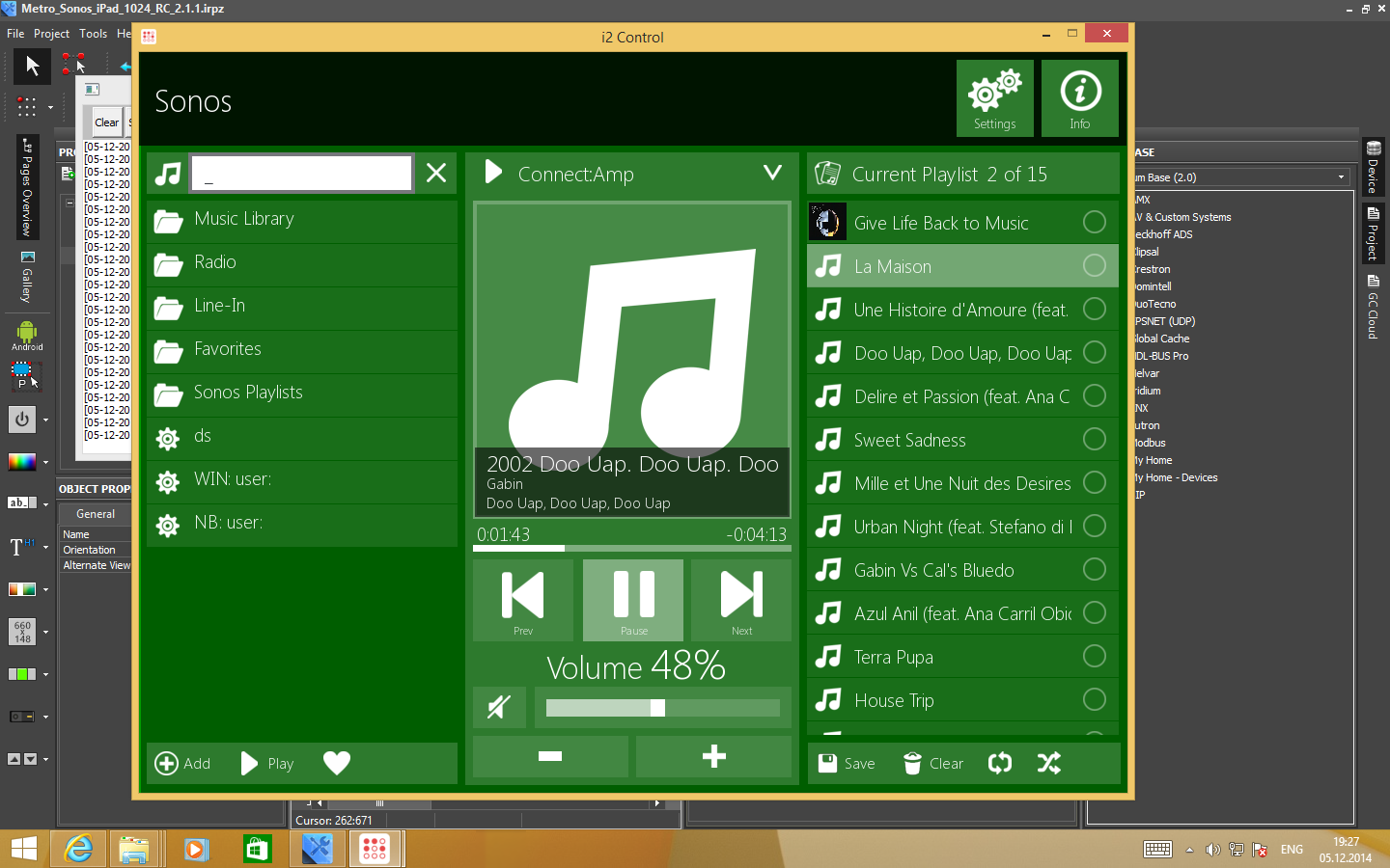 В качестве сценария интеграции в систему домашней автоматизации мы проверили взаимодействие с контроллером iRidium. Работу с системой Sonos в нем реализовать максимально просто, поскольку можно использовать готовые шаблоны. Они полностью работоспособны и позволяют реализовать на панели управления полноценное управление плеерами.