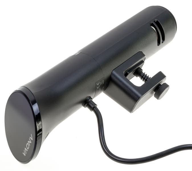 Gemlux GL-SV800BLR представляет собой цилиндр, состоящий из ручки управления и металлического кожуха с нагревательным элементом внутри, заканчивающегося маленькой крыльчаткой под пластиковым колпачком. Сзади, посередине конструкции, располагается карабин-прищепка для крепления устройства внутрь емкости с водой.